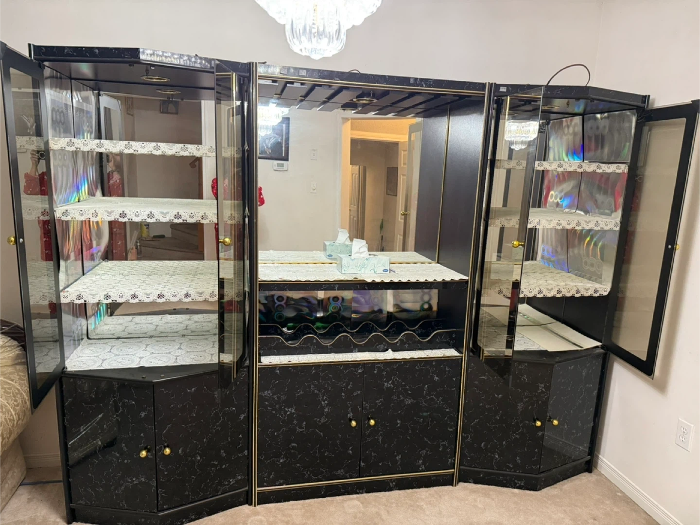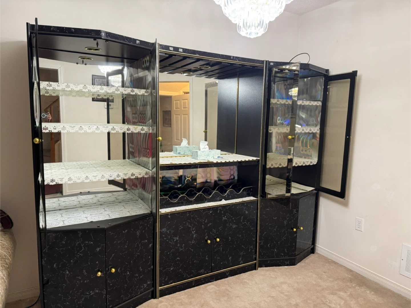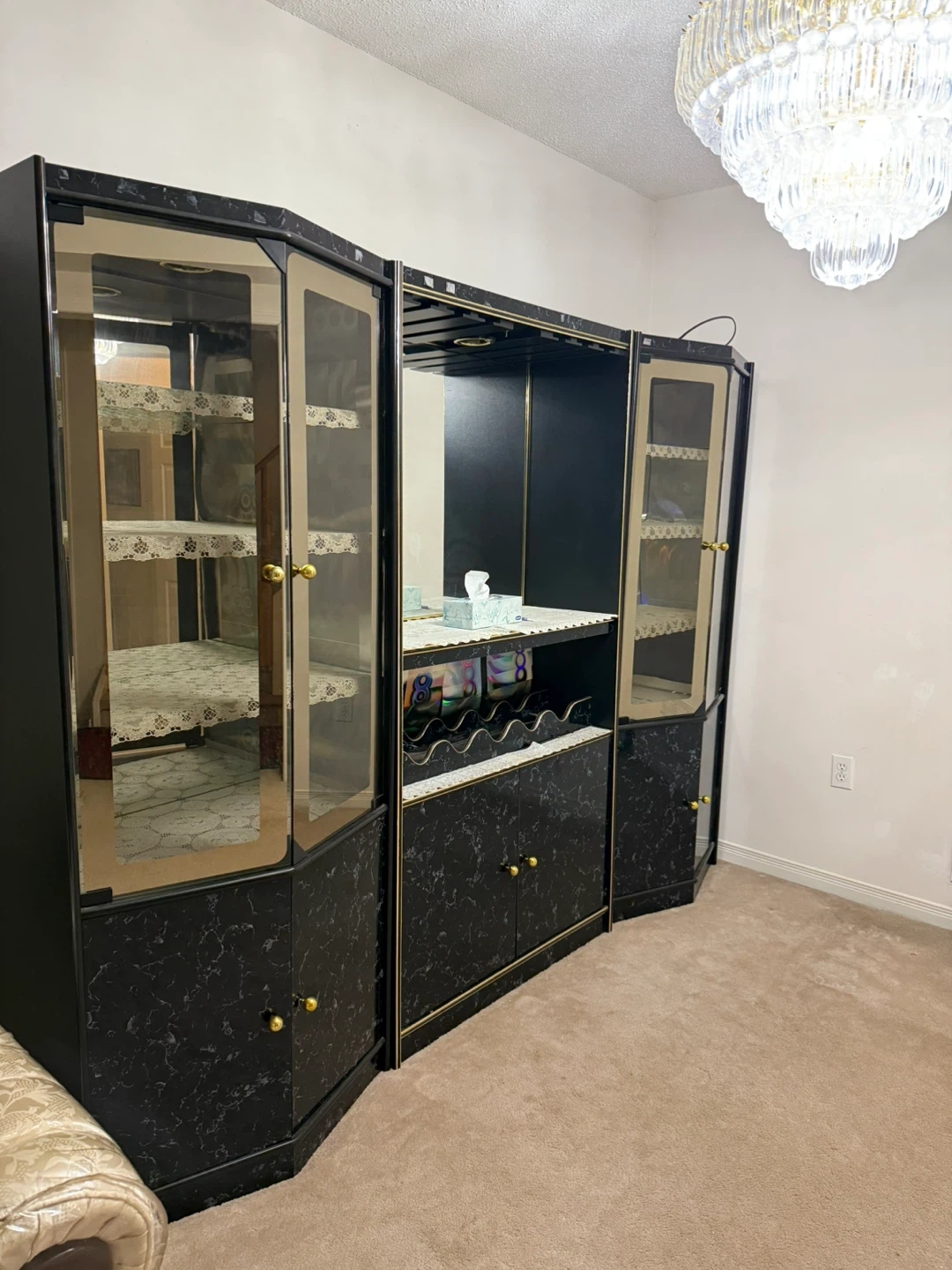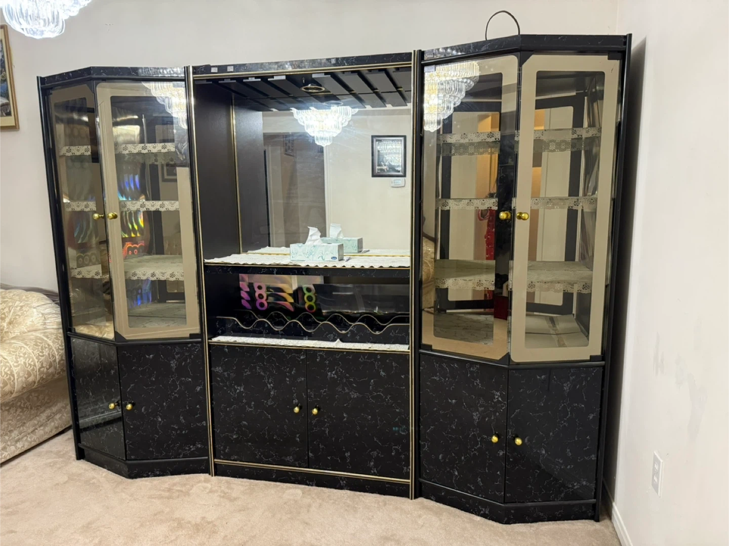 This bar cabinet wall unit features a black marble-look finish with gold accents. It includes glass display shelves and a central wine glass rack. Ample storage with lower cabinet doors. It comes in 3 separate pieces and the middle piece also has a light option.