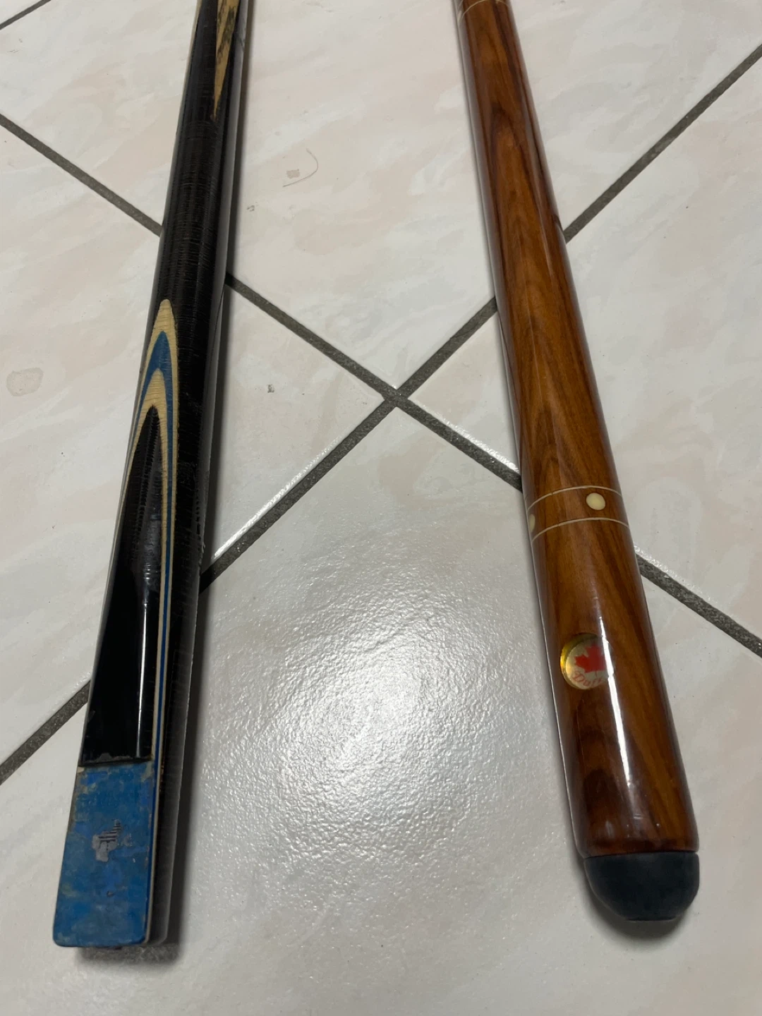 Two pool cues included with a black carrying case. One cue features a light wood grain with dark accents and inlay rings. The other cue has a dark wood finish with similar inlay details. These cues are ready for your next game!