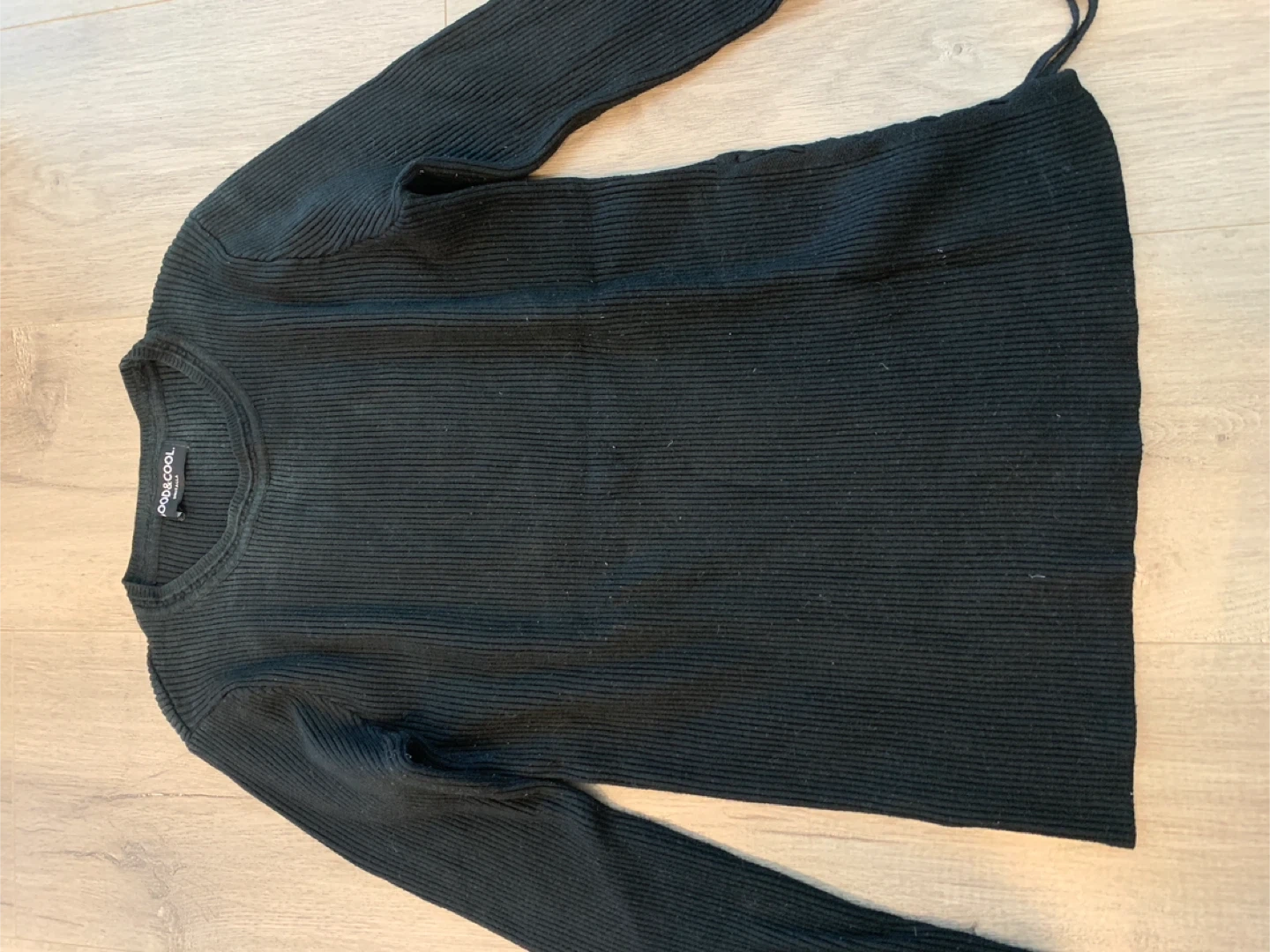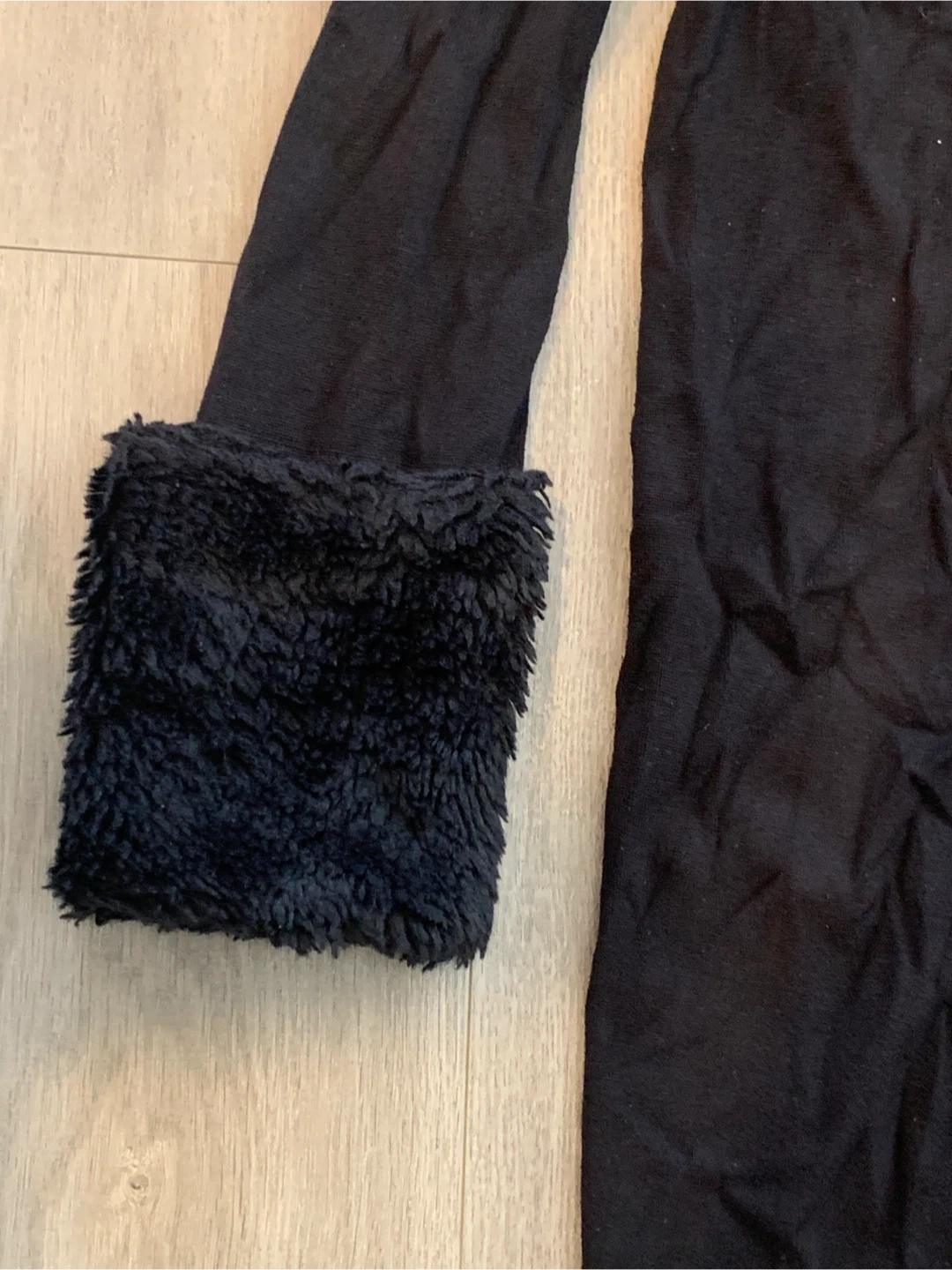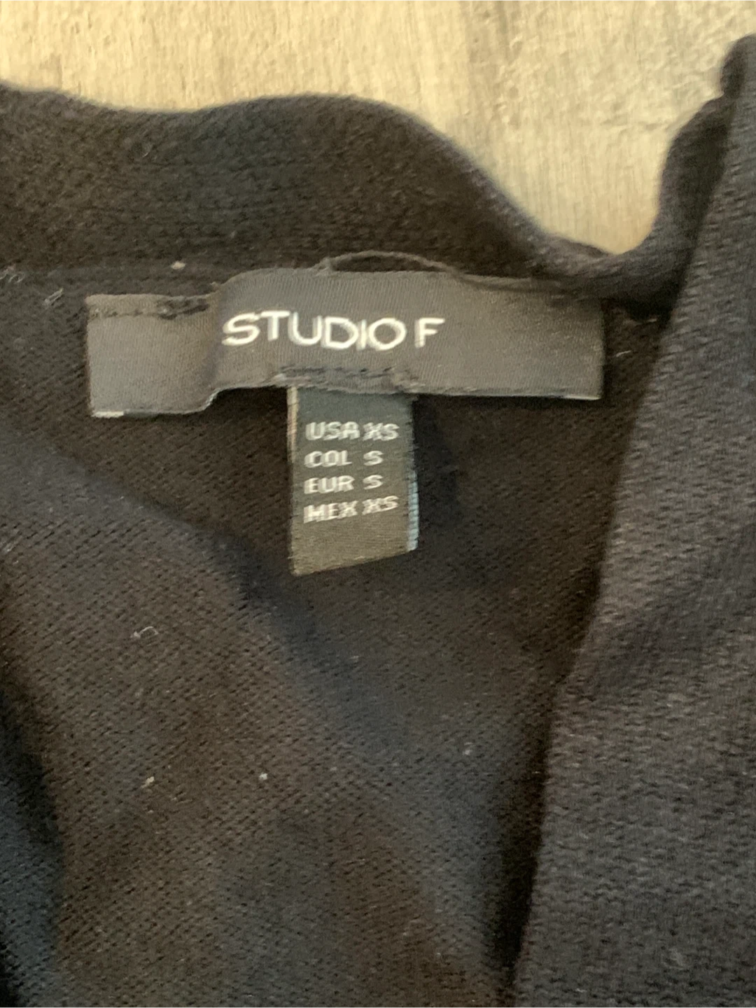 This is a black STUDIO F cardigan. It features contrasting fuzzy cuffs. Size is XS. Also included another black shirt. pick up only.