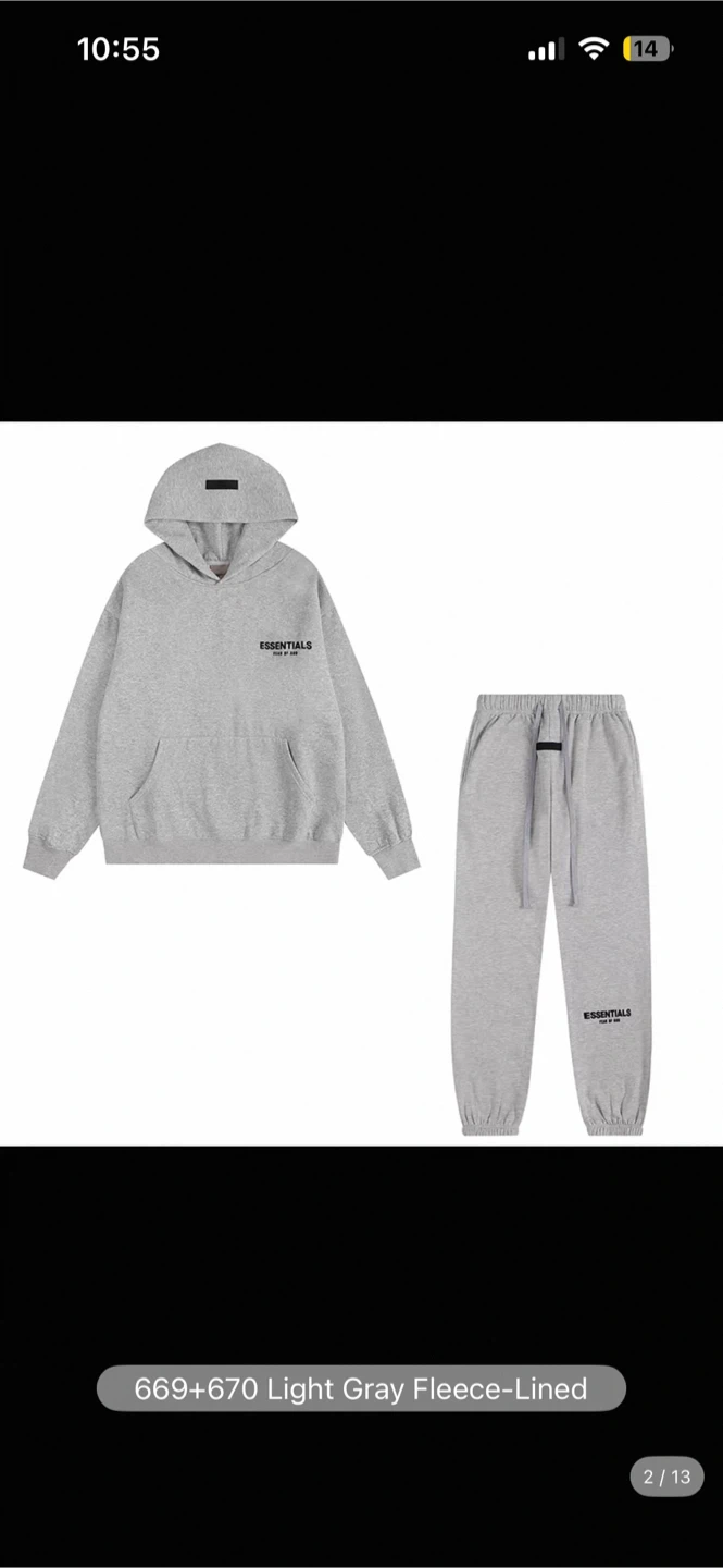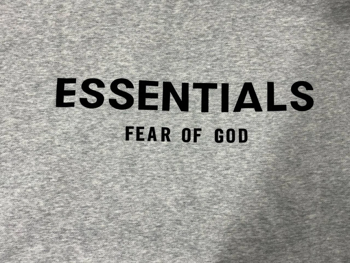 ESSENTIALS Fear of God hoodie in light grey. It's a size medium and made from a fleece-lined material. This comfy hoodie is great for everyday wear.