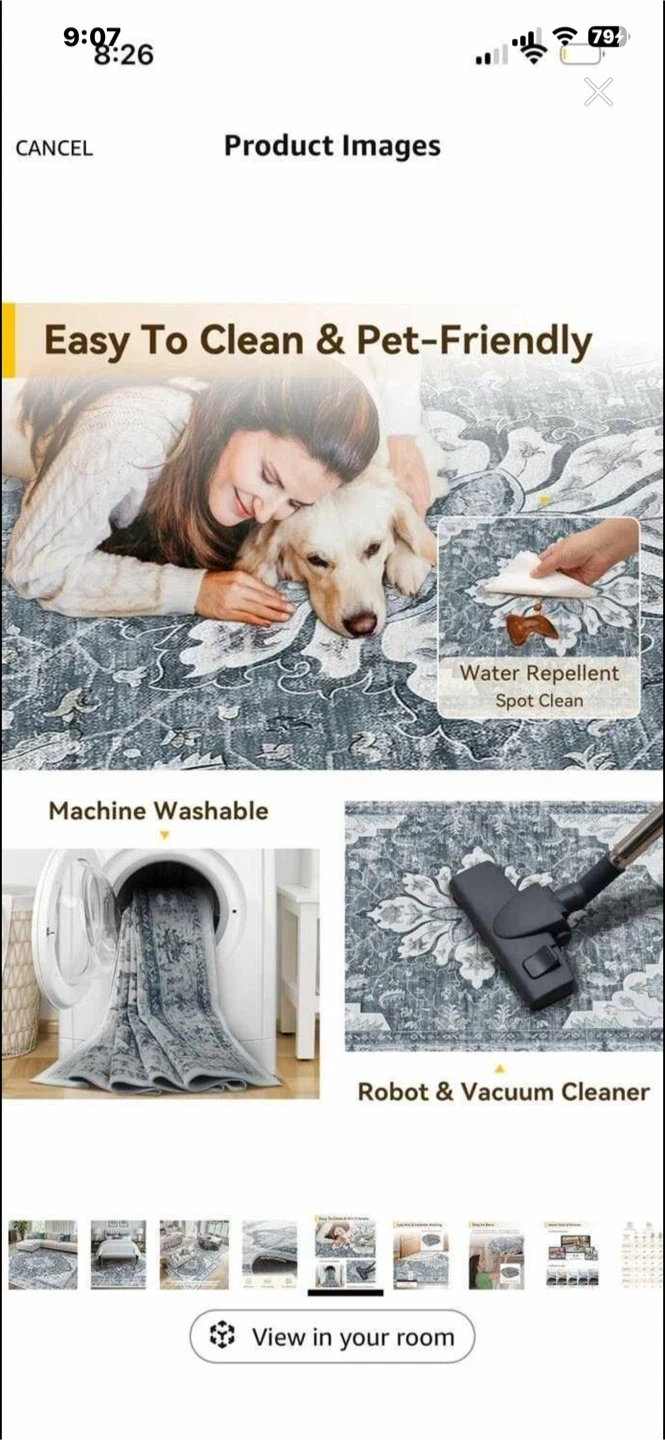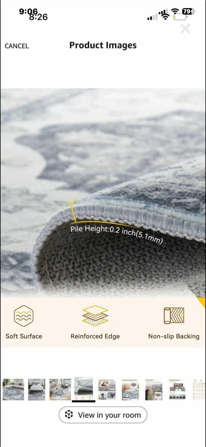 This 8x10 area rug features a distressed floral pattern that's water repellent and easy to clean. It's machine washable and has a non-slip backing. The soft surface pile height is 0.2 inches.