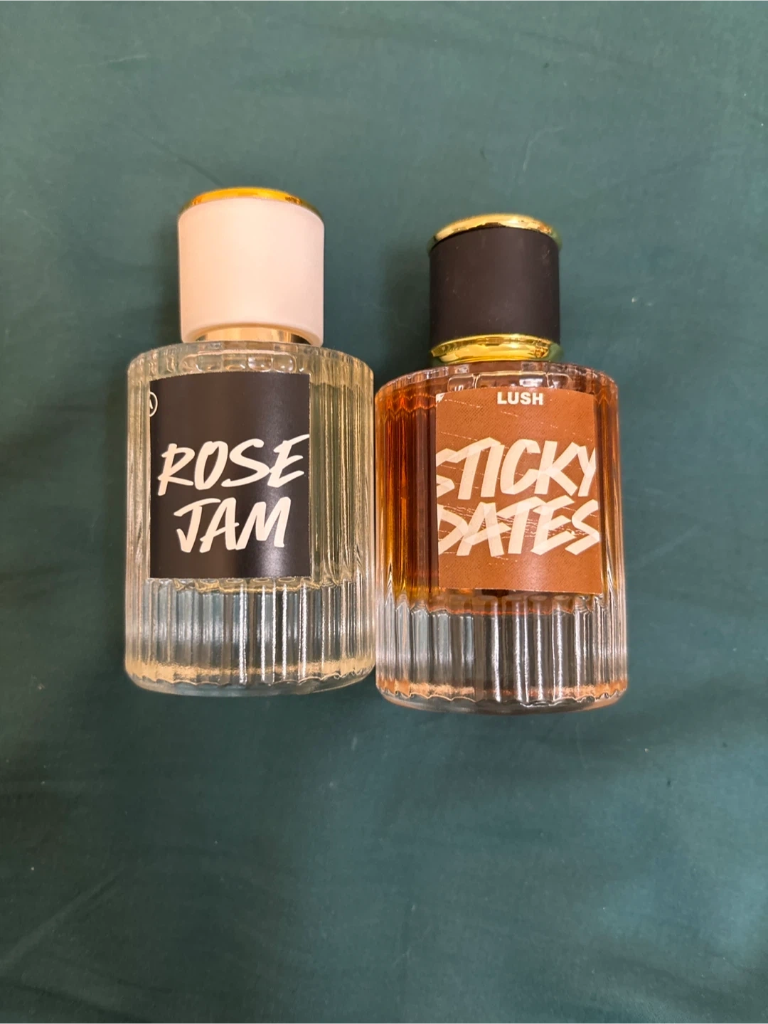 Two Lush brand perfumes: Rose Jam and Sticky Dates. Each in a 50 ml glass bottle
