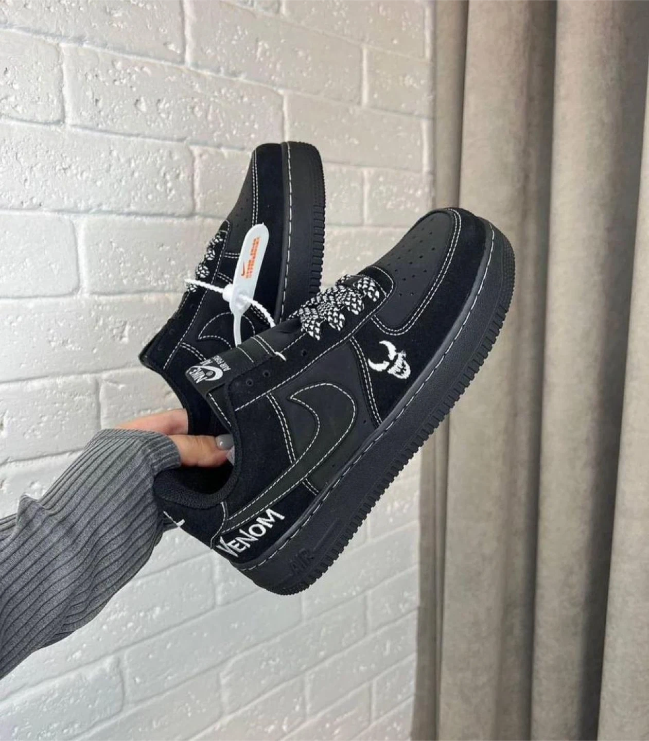 Selling a pair of Nike Air Force 1 Low custom sneakers in black with Venom detailing! These shoes have a unique design and are in great condition. Perfect for adding a touch of style to your wardrobe