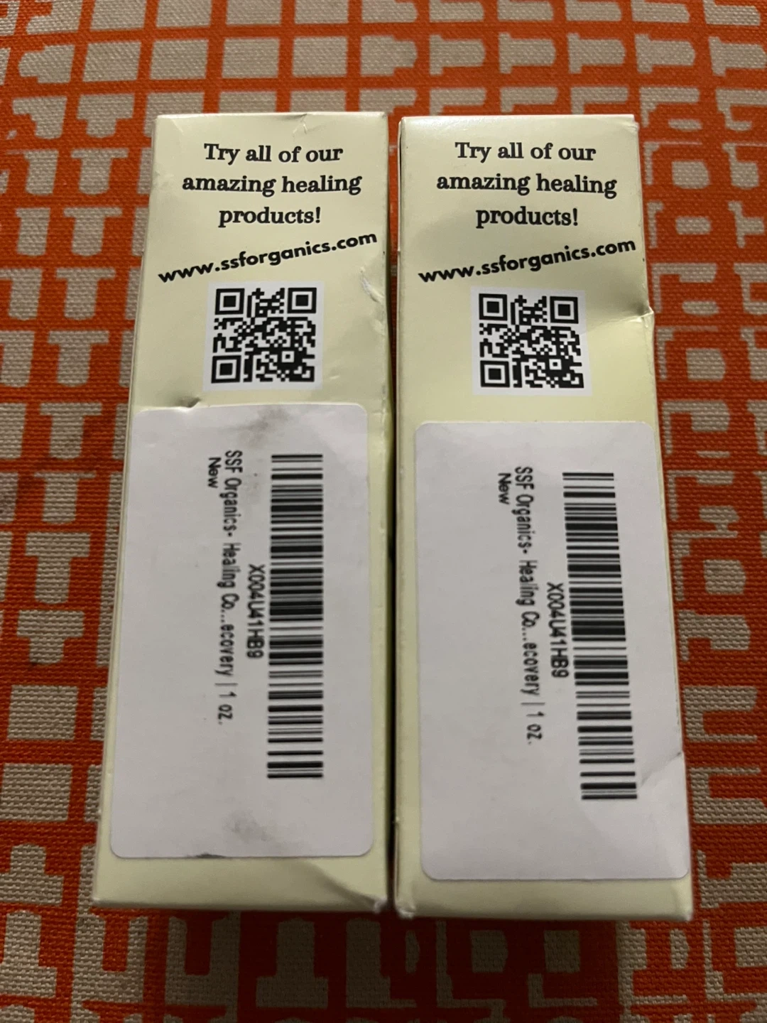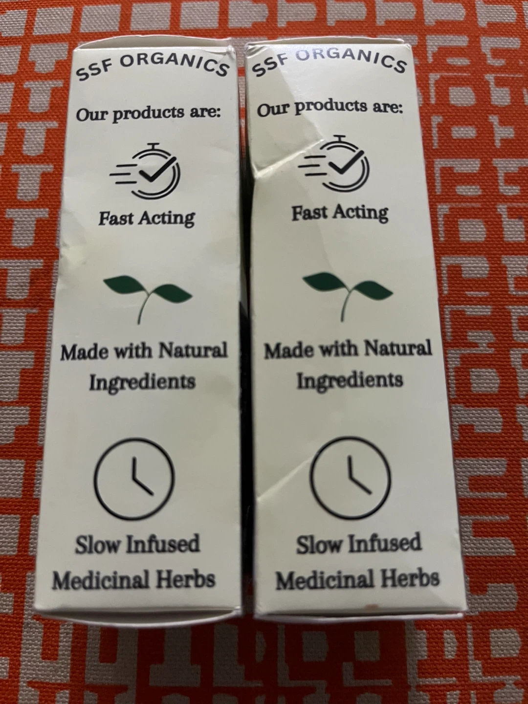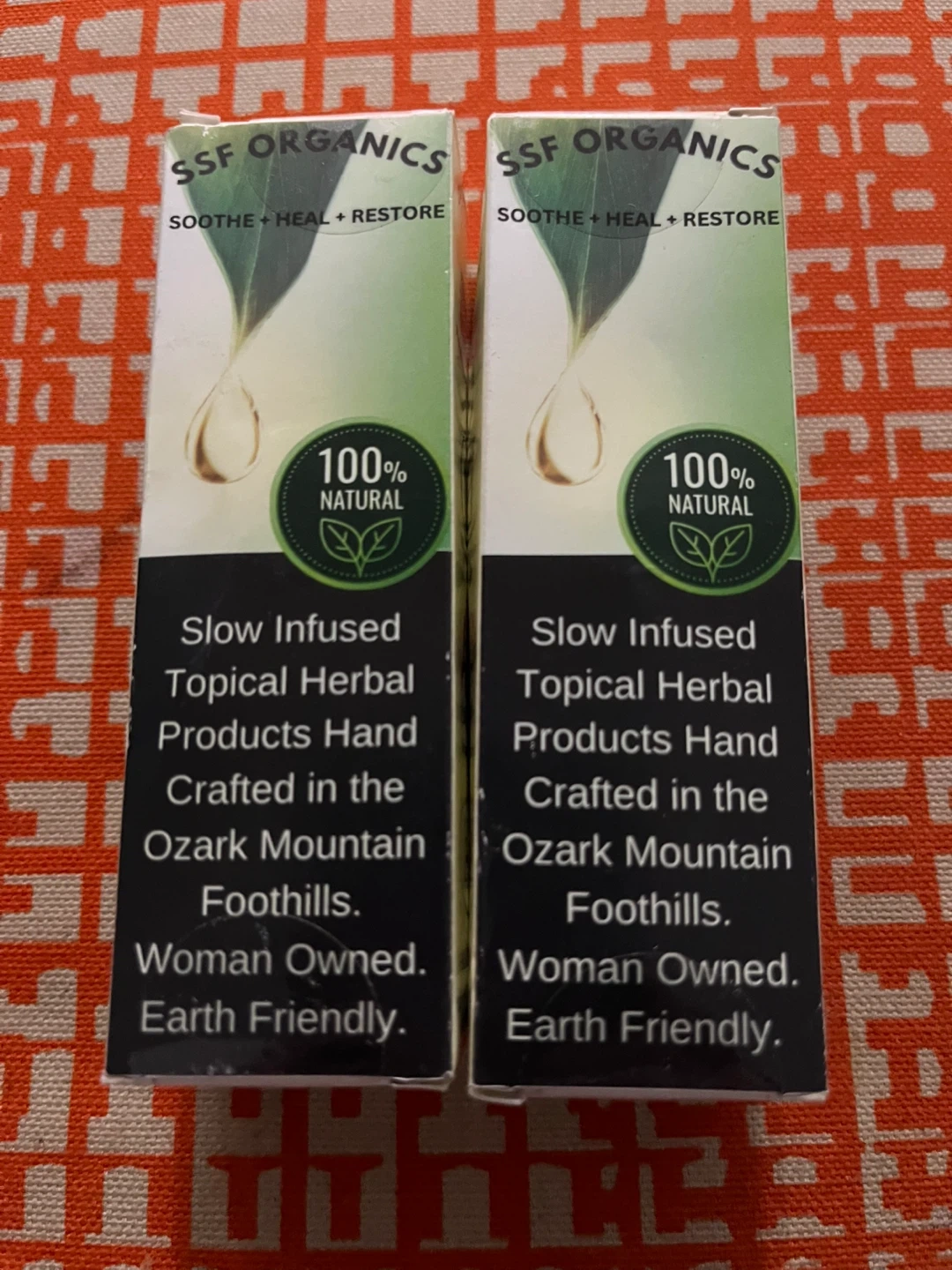 Two bottles of SSF Organics' slow infused topical herbal products. Hand-crafted with natural ingredients in the Ozark Mountain Foothills. These products are woman-owned and earth-friendly. Each bottle contains 1 oz.