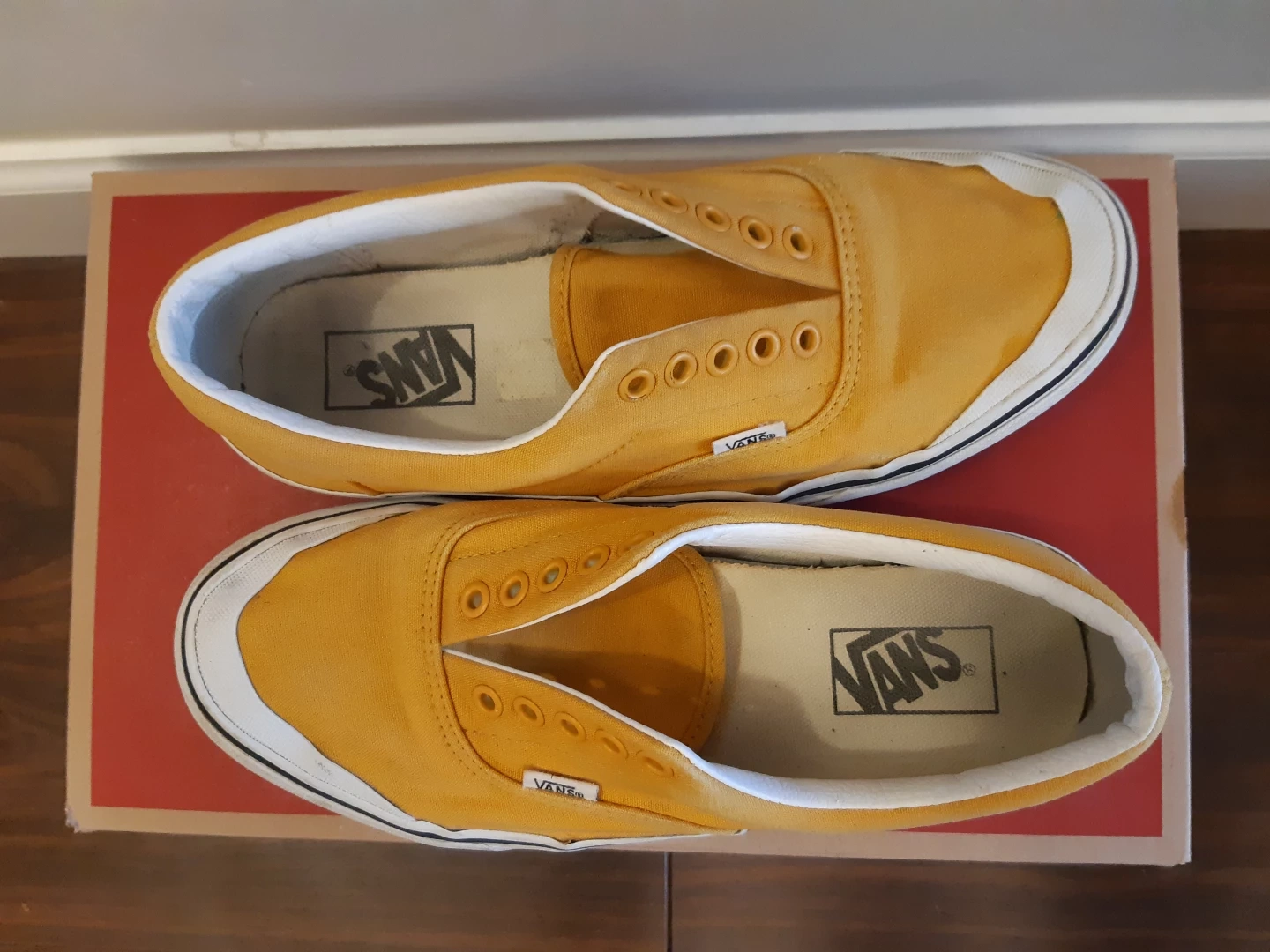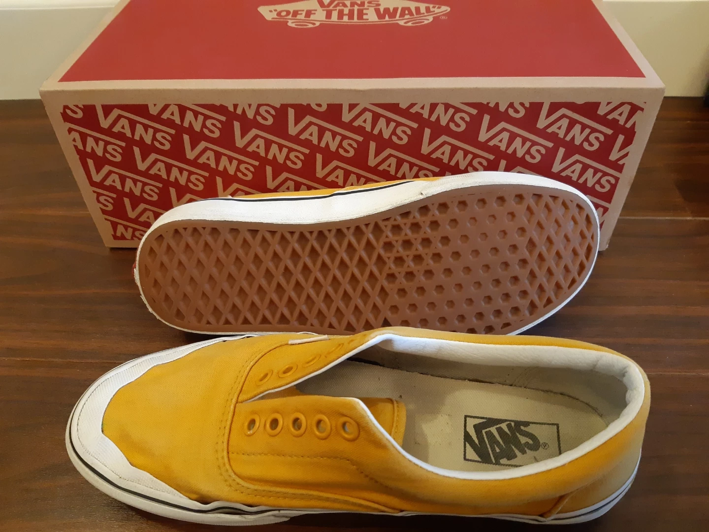 Men's size 8.5 Vans Era shoes. Mustard yellow canvas upper, white sidewall, and waffle outsole. Comes in original box. Pre-owned.
