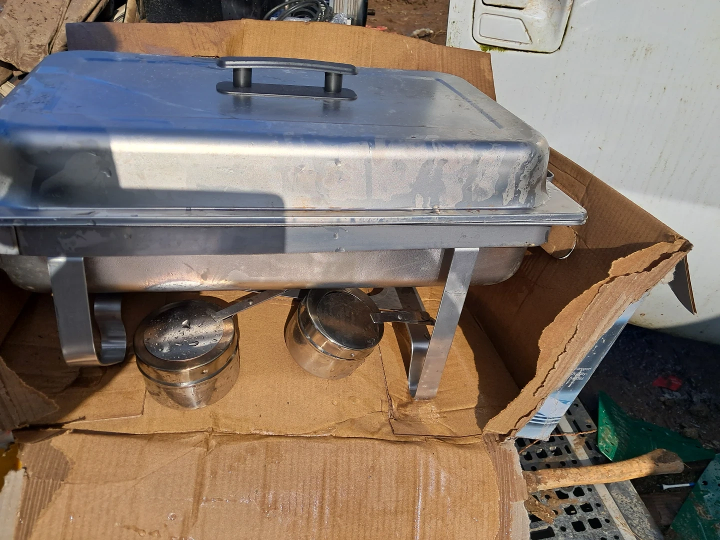 This is a stainless steel chafing dish with a lid and two fuel holders. It's ideal for keeping food warm at gatherings and events. The durable stainless steel construction ensures longevity.