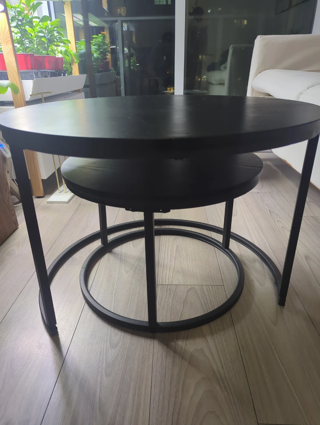 Selling a set of black nesting coffee tables! They're in great shape and would look lovely in any living room. The larger table is 27.36"/69.5cm wide and 19.09"/48.5cm tall, while the smaller one is 19.49"/49.5cm wide and 13.98"/35.5cm tall. I bought them for $109.99
