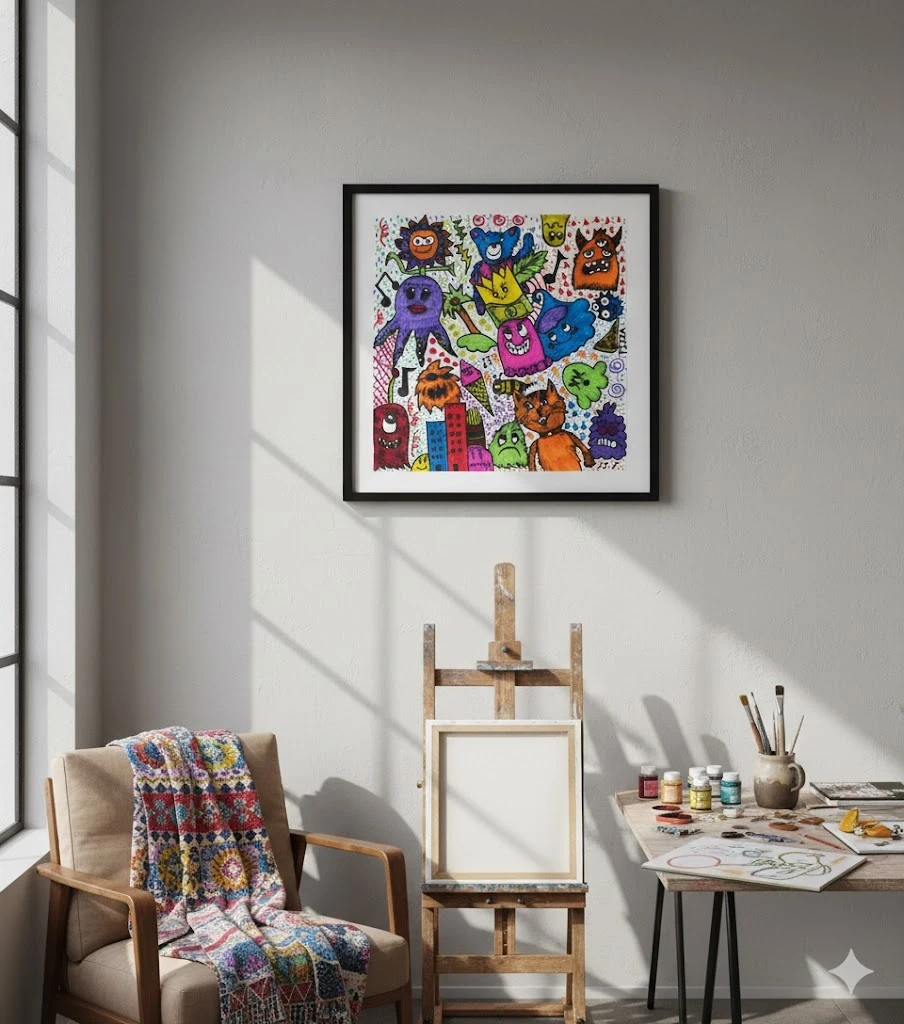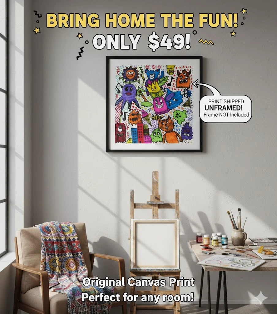 Vibrant canvas art featuring a playful mix of colourful monsters, doodled elements, and cityscapes. This piece adds a fun, energetic touch to any space. Hand-drawn artwork on canvas. Size: 12x12" 30.48cmx30.48cm