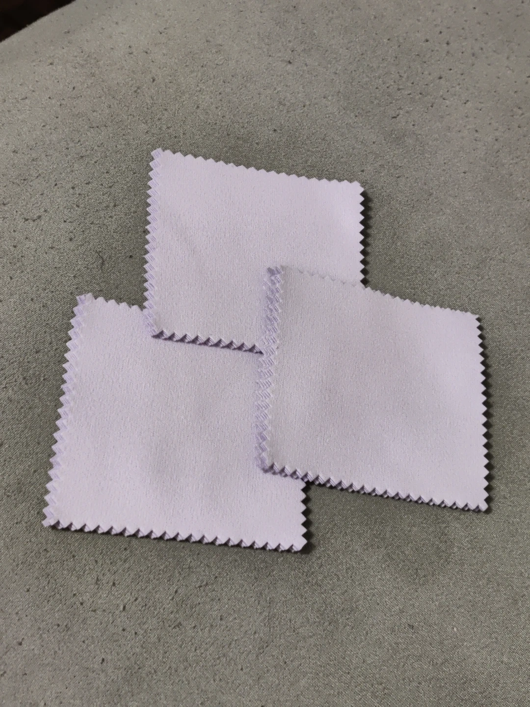3 sets of thickened jewelry polishing cloths in light purple. Both sides can be used. The cloths are 8cm/3.14inch squares and are designed for cleaning and maintenance. They shine jewelry like new!