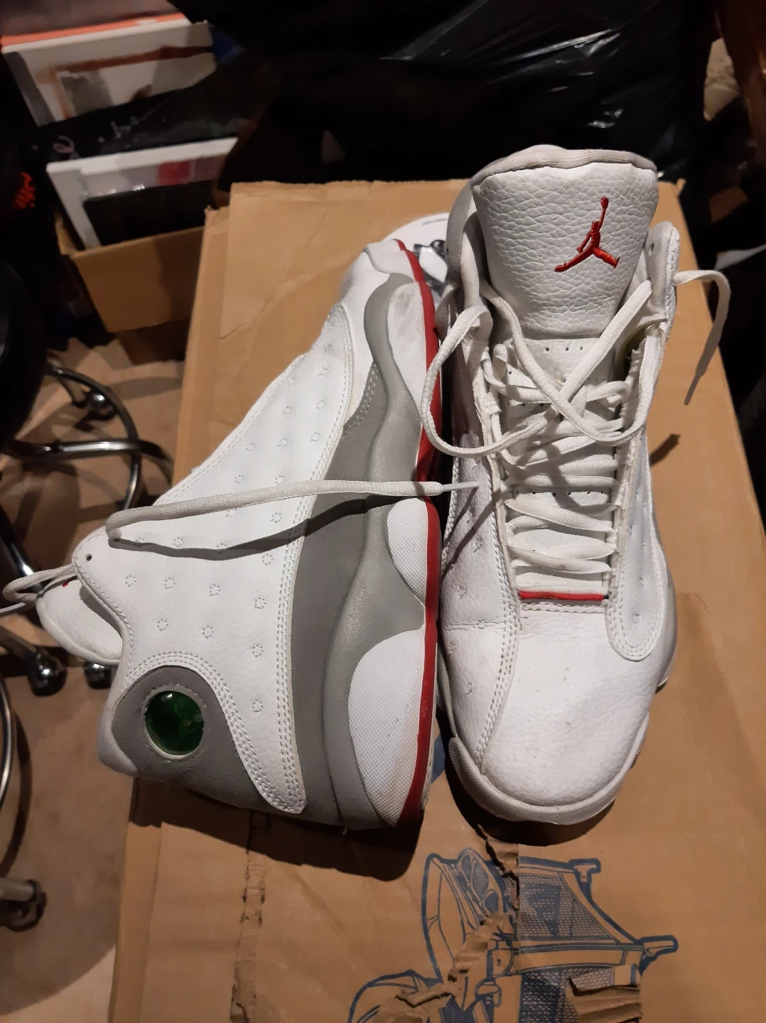 Classic Jordan 13s in white, red, and grey. These sneakers feature a tumbled leather upper with signature Jordan branding. They're a stylish choice for everyday wear or on the court.