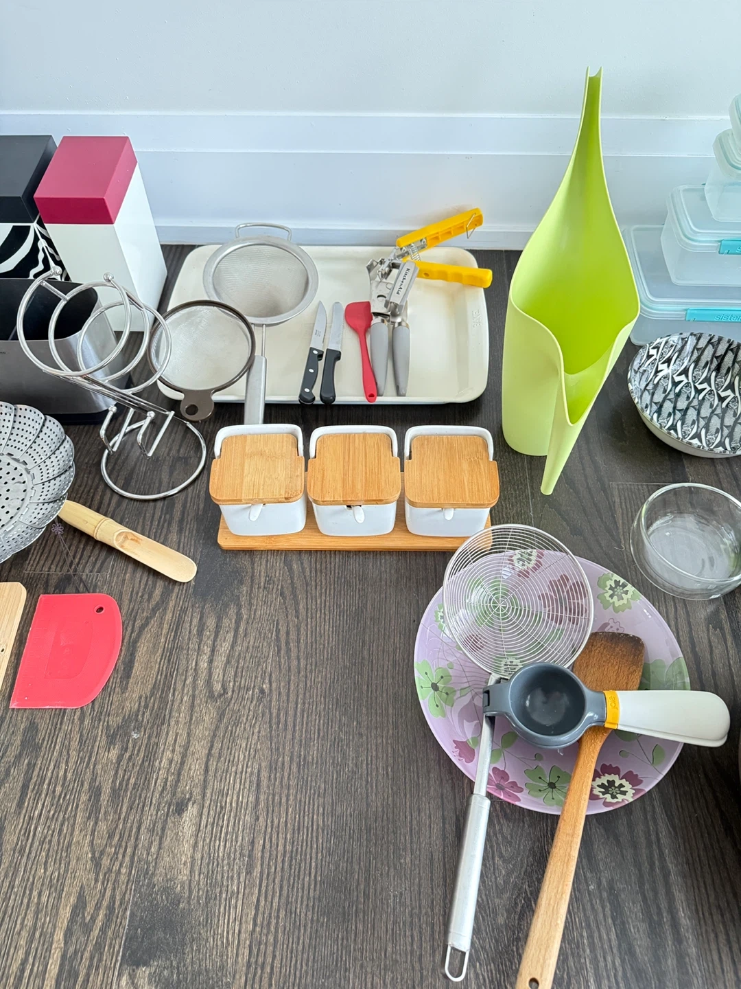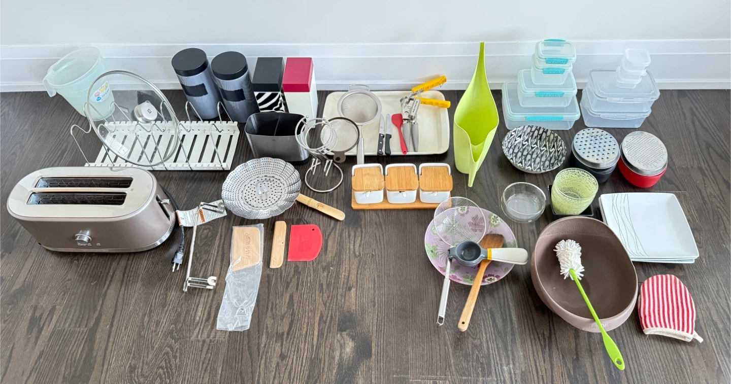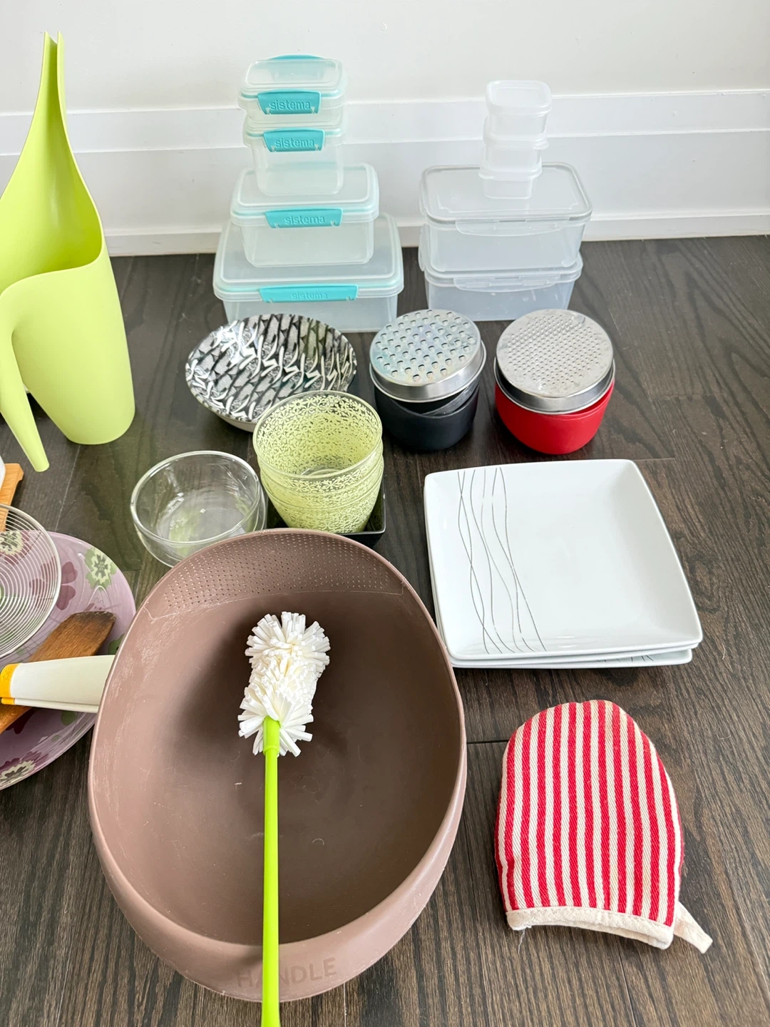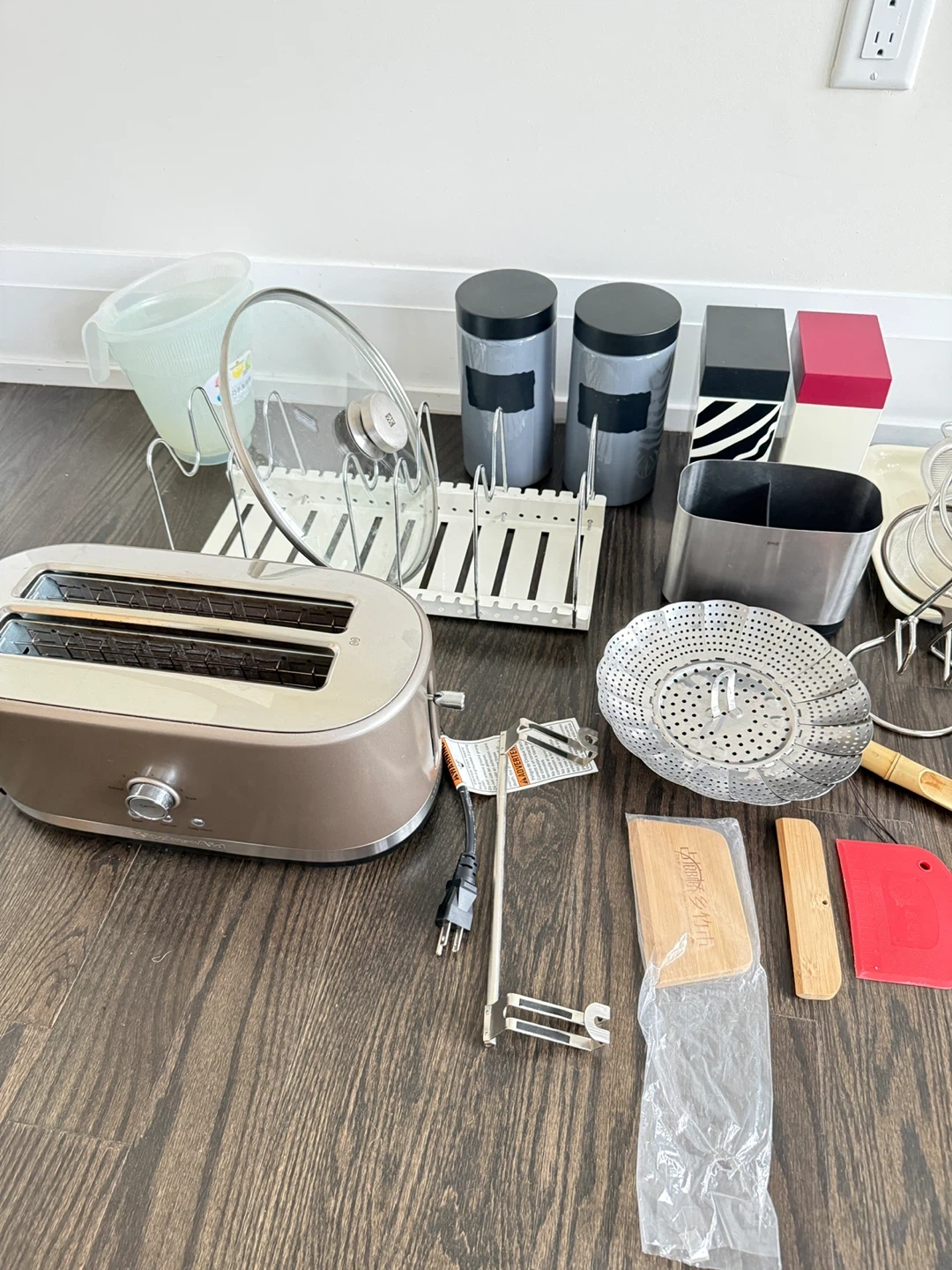 This lot includes a toaster, food storage containers, strainers, graters, spatulas, a whisk, a citrus juicer, and a bottle brush. Many useful kitchen tools and storage solutions are bundled together here. Please DM for price
