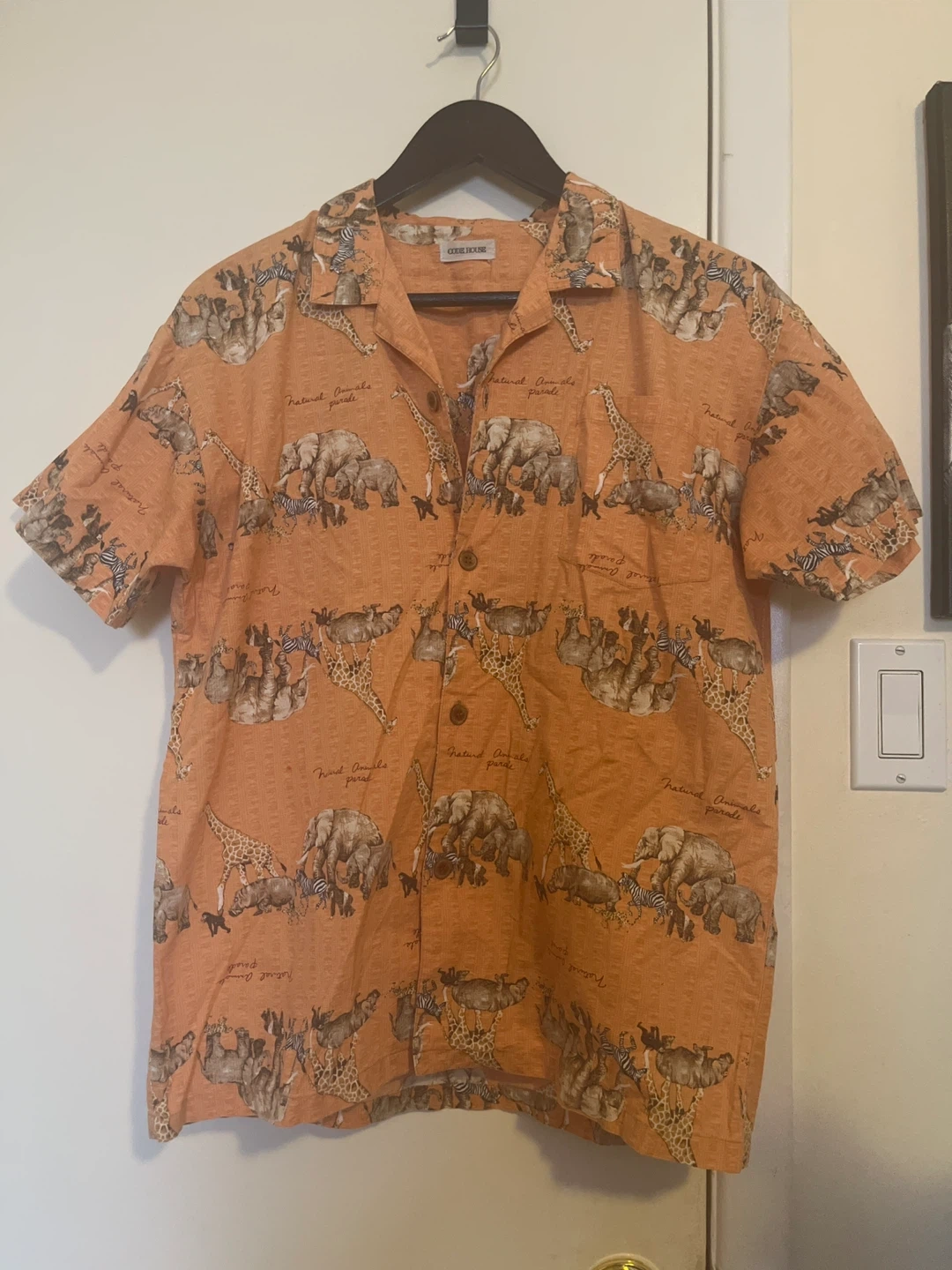 Short sleeve button up shirt with a natural animals parade print. Button closure. Great for a cruise!