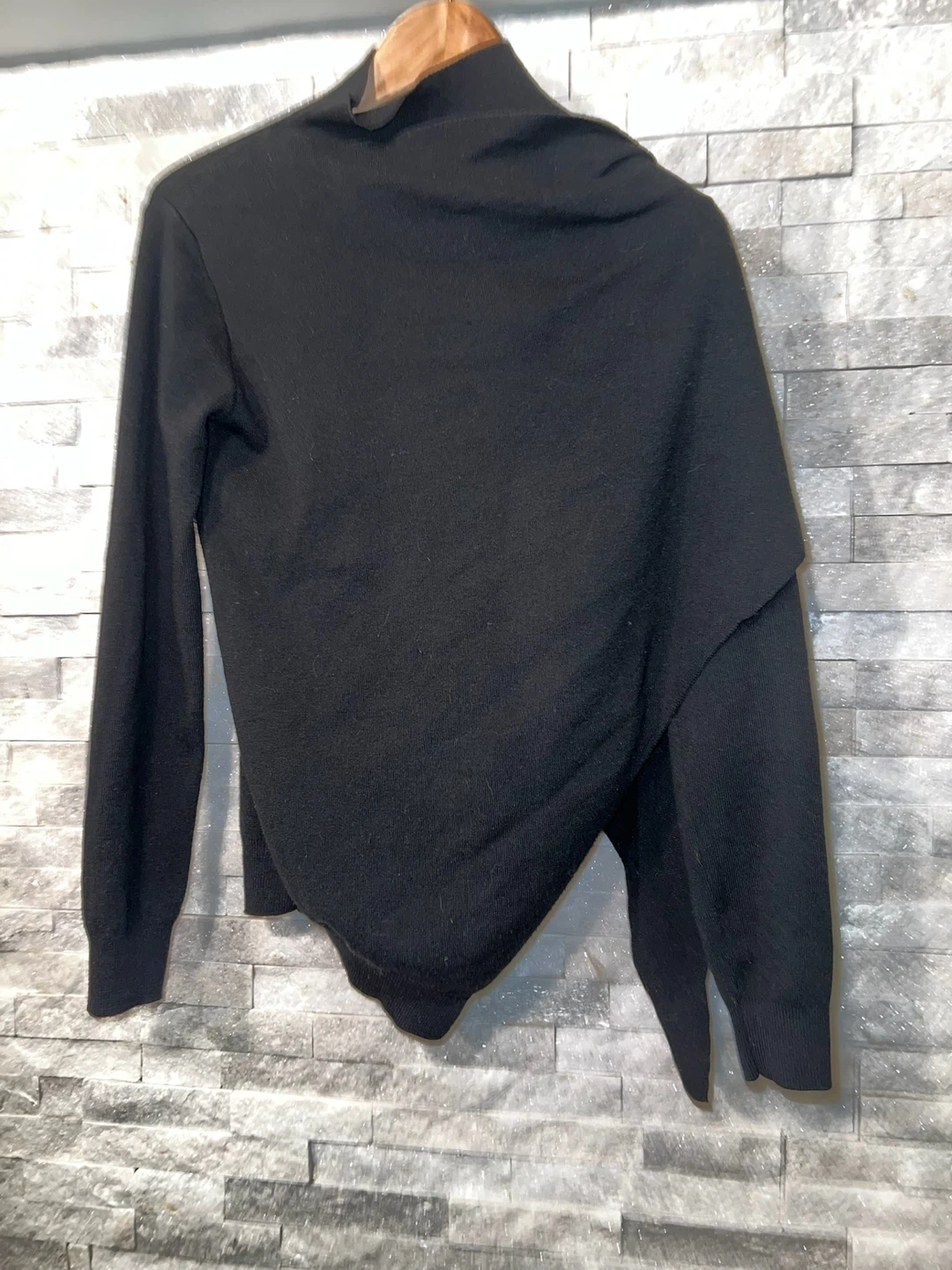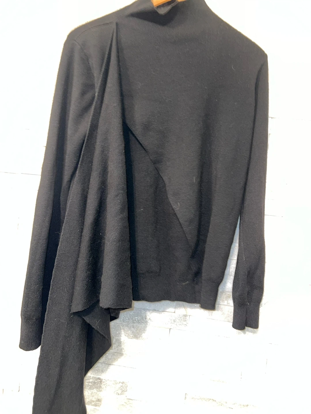 This black cardigan features a unique waterfall design. It's made with a soft knit material. Perfect for layering over outfits for a stylish touch!