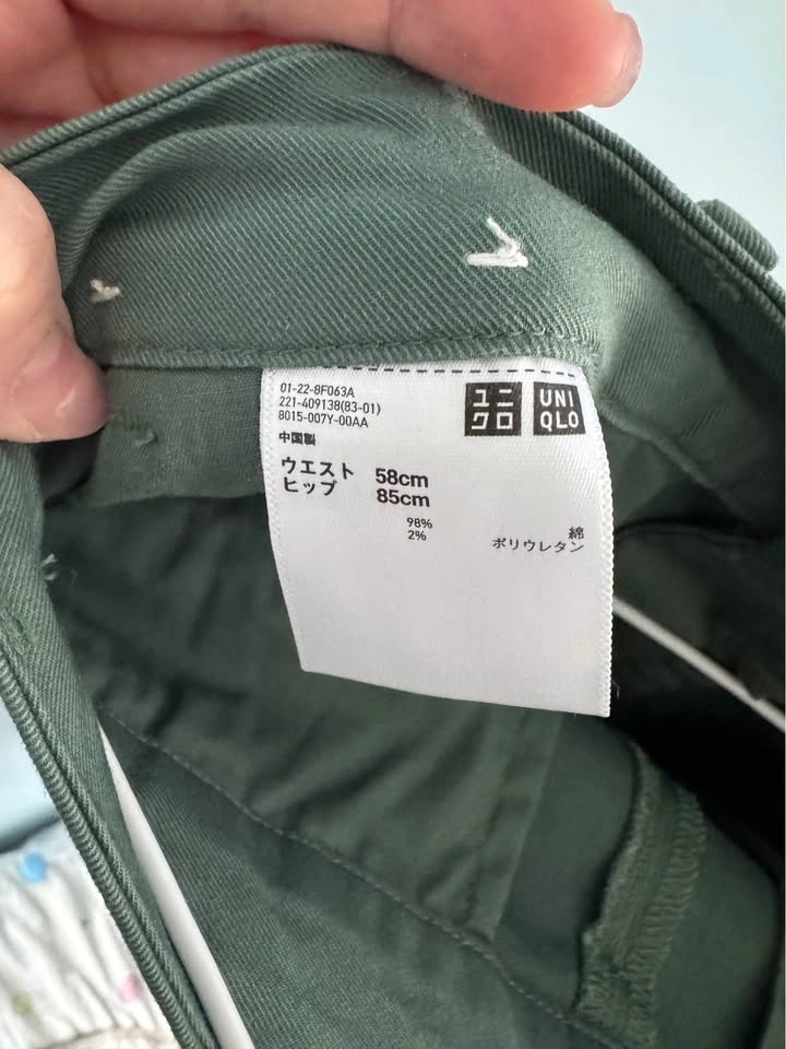 Women’s pants from Uniqlo, bought in Japan. Never worn, but tags removed. Comfortable cotton with stretch. Classic olive green color. Great for casual or office wear. Size: XS (waist approx. 58 cm). Condition: Like new.