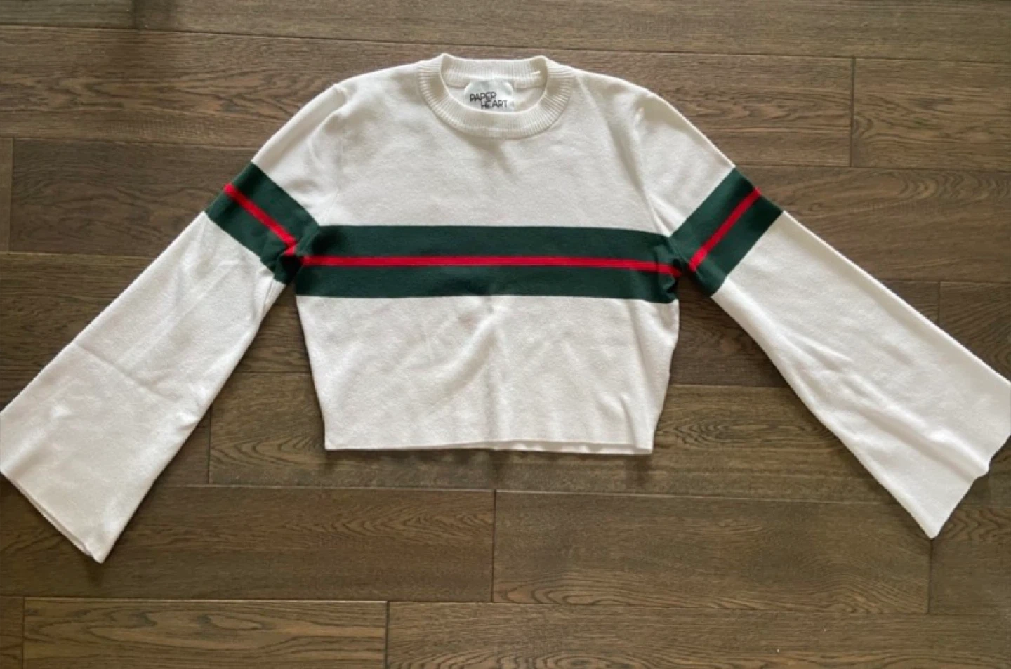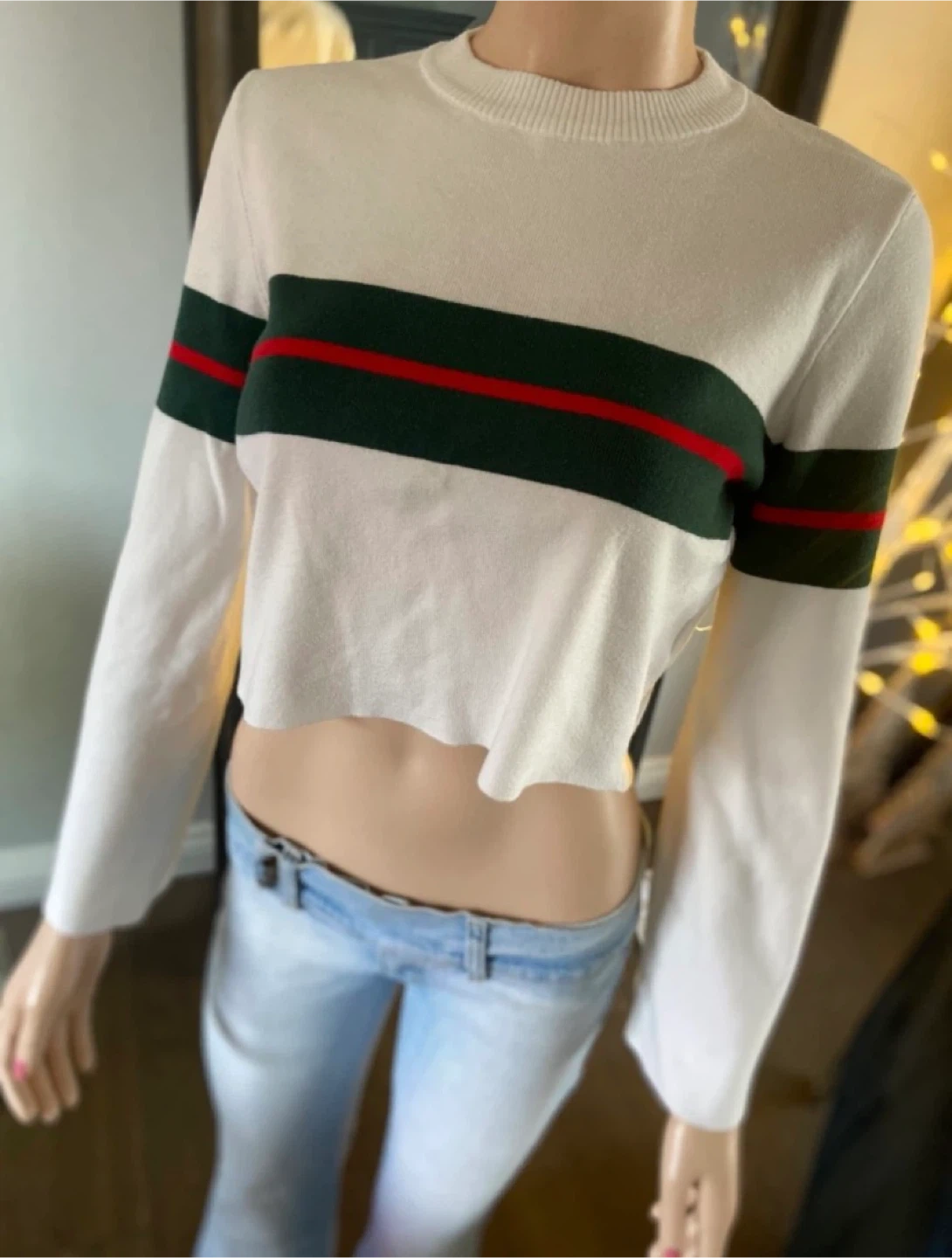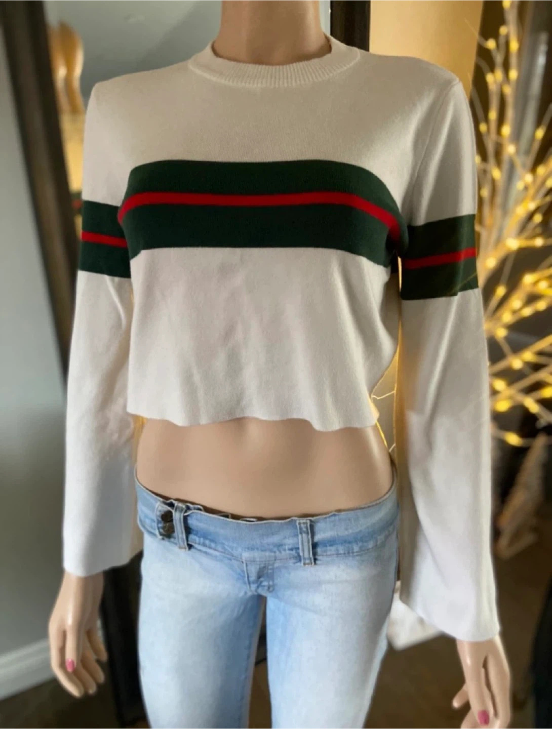 This cream cropped sweater by Paper Heart features horizontal green and red stripes across the chest and sleeves