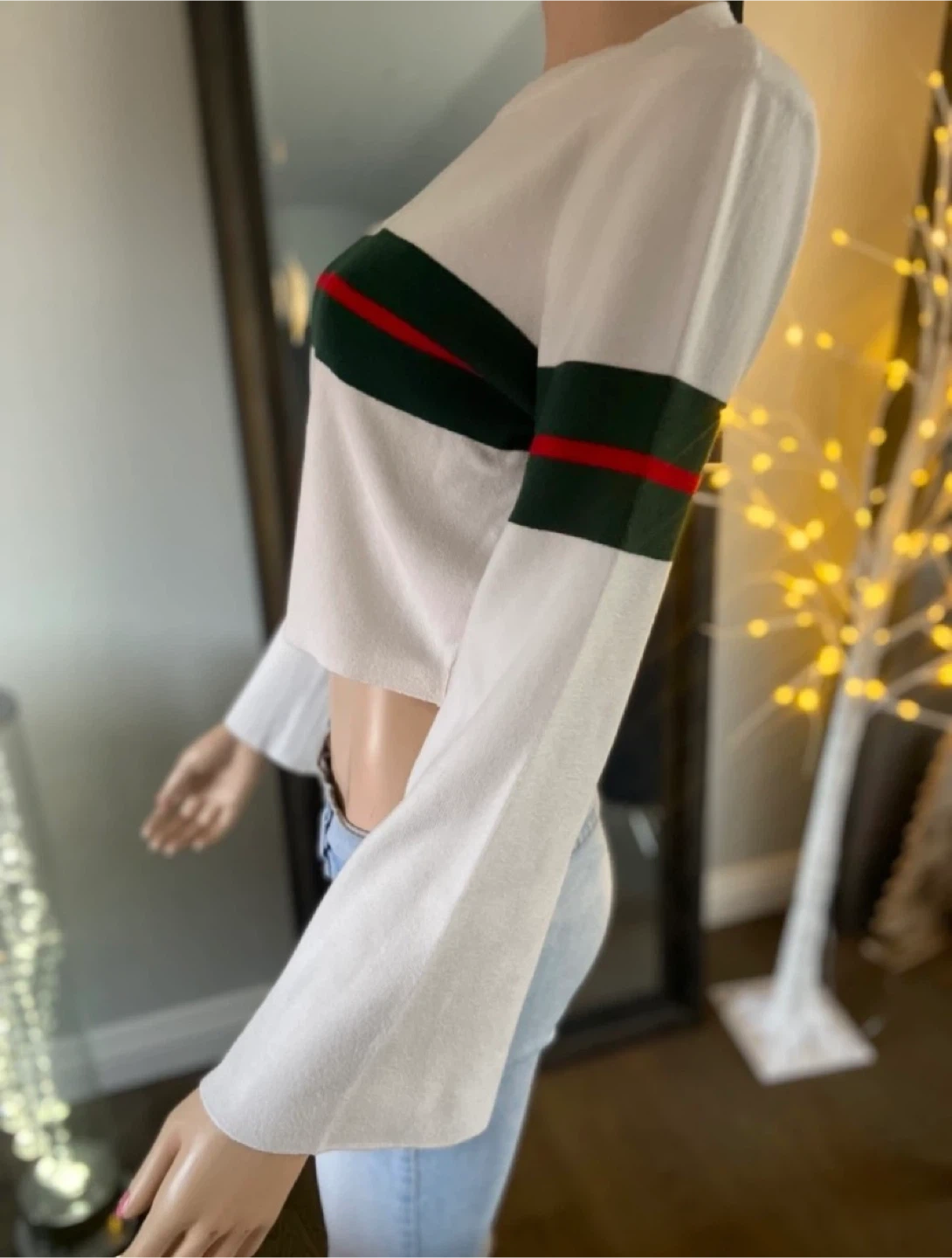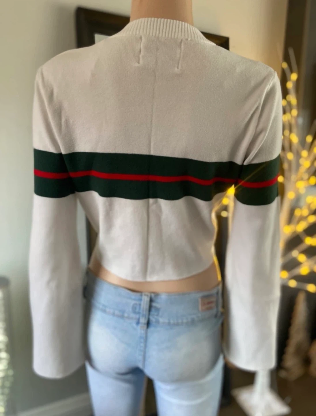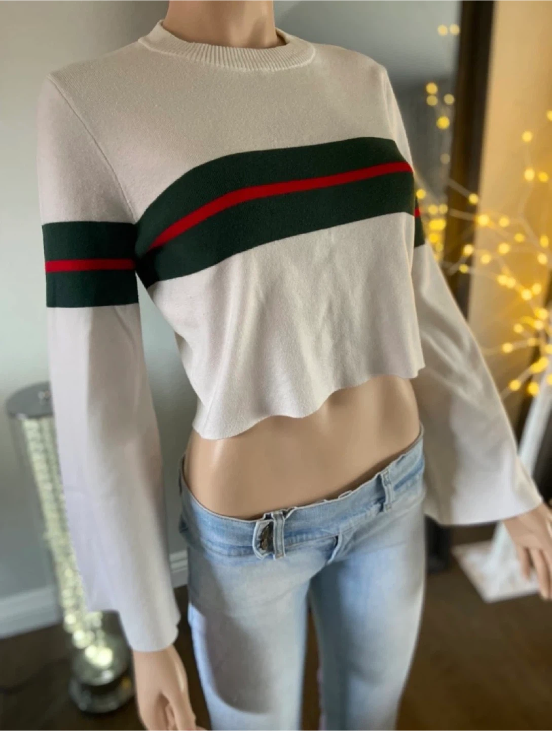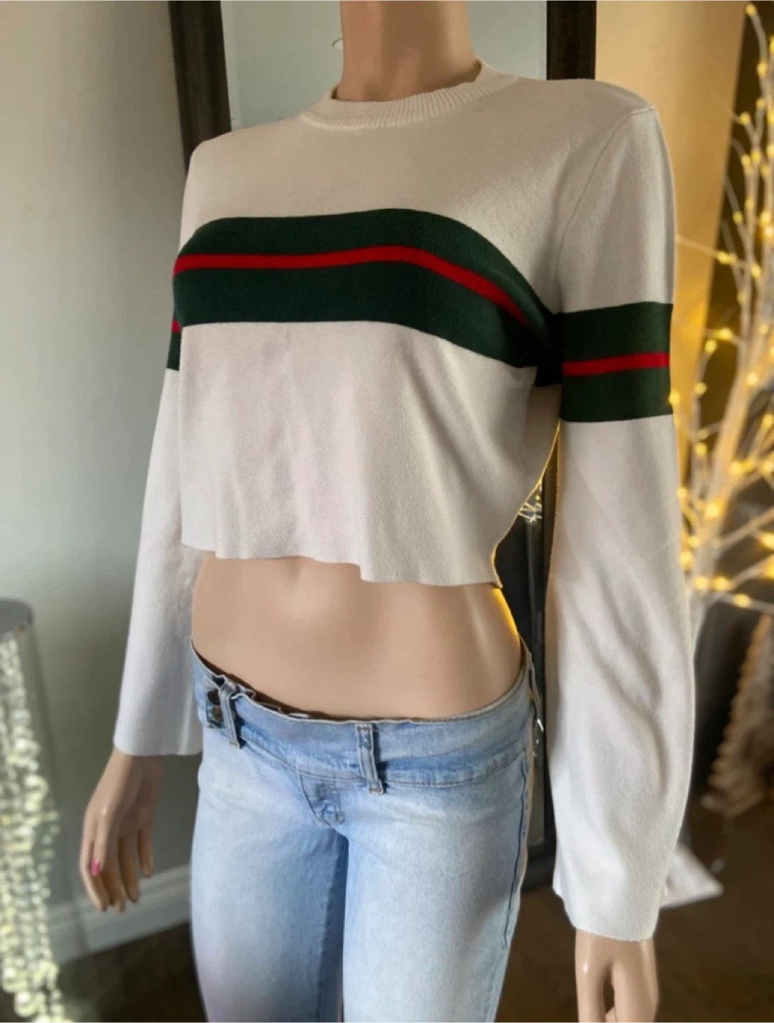 This cream cropped sweater by Paper Heart features horizontal green and red stripes across the chest and sleeves