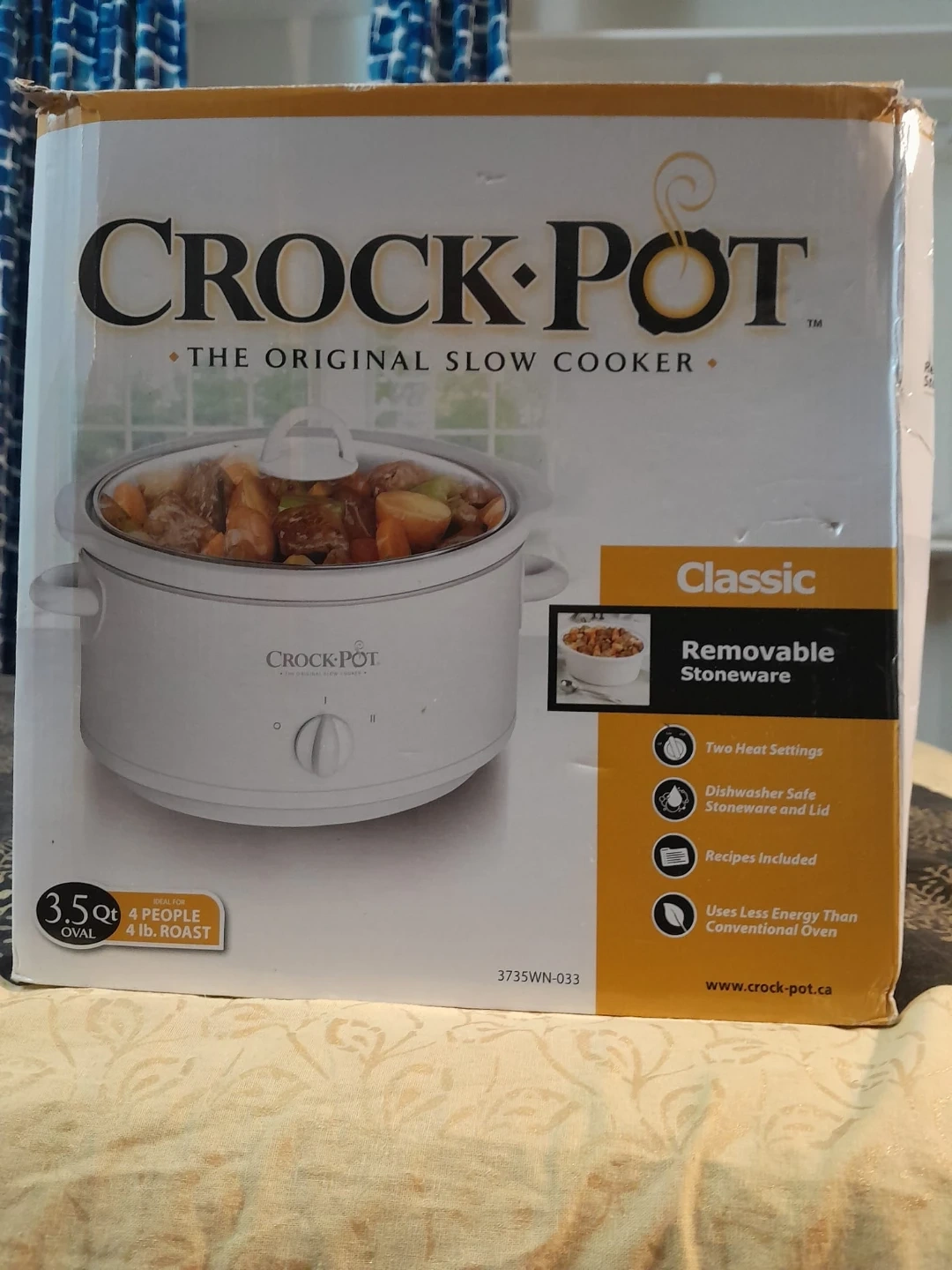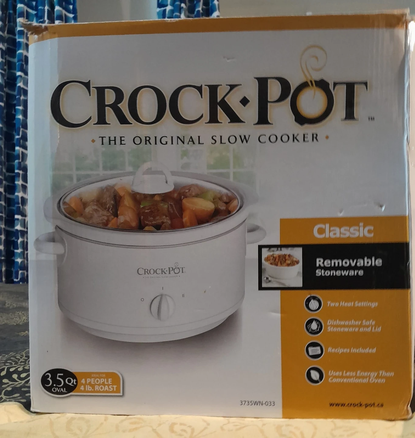 Crock pot on sale. 3.5 qrt oval shape, good for 4 people 4lb roast meal. Removable Stoneware pot inside with 2 heat settings for Slow cooking.
