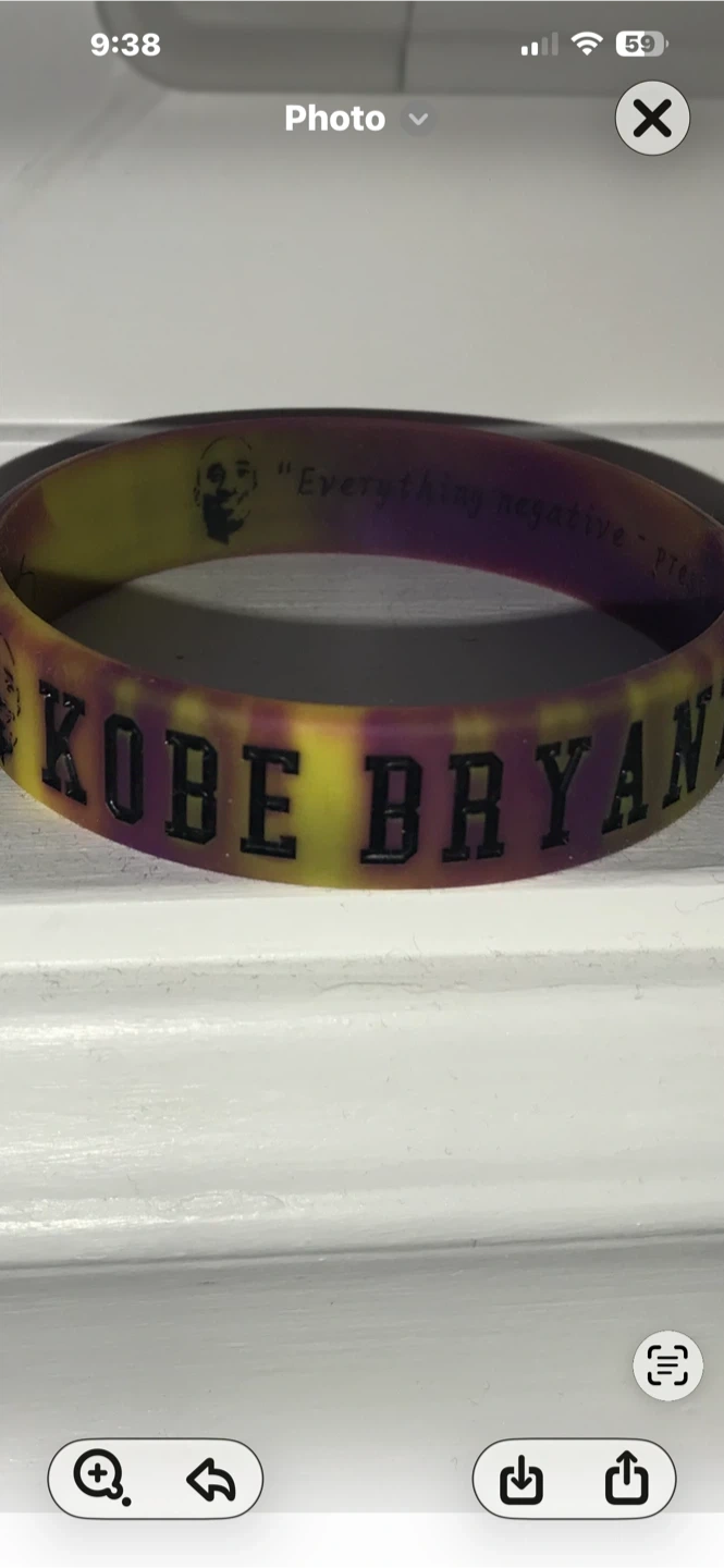 This is a Kobe Bryant silicone wristband. It has a yellow and purple tie-dye pattern. It's debossed with "KOBE BRYANT" and a picture of Kobe Bryant with the quote "Everything negative – pressure like diamonds."