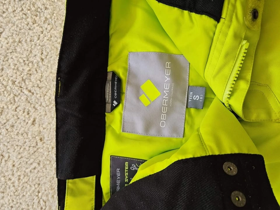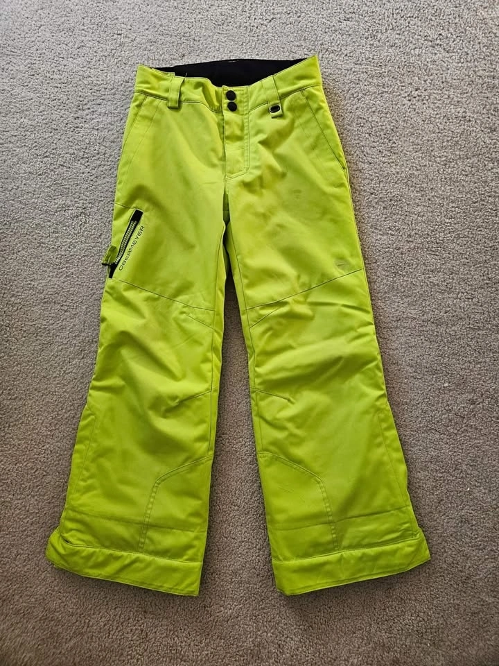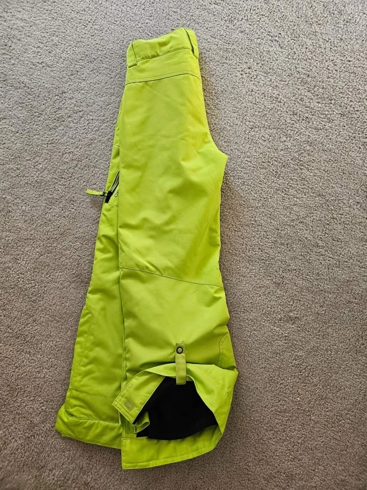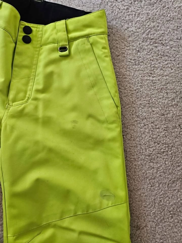 Very warm, waterproof snowpants. Son outgrew them. Legs have been extended using the extended wear system. One small tear fixed using tenacious tape. Small stains. Freshly washed and re-waterproofed using nikwax.