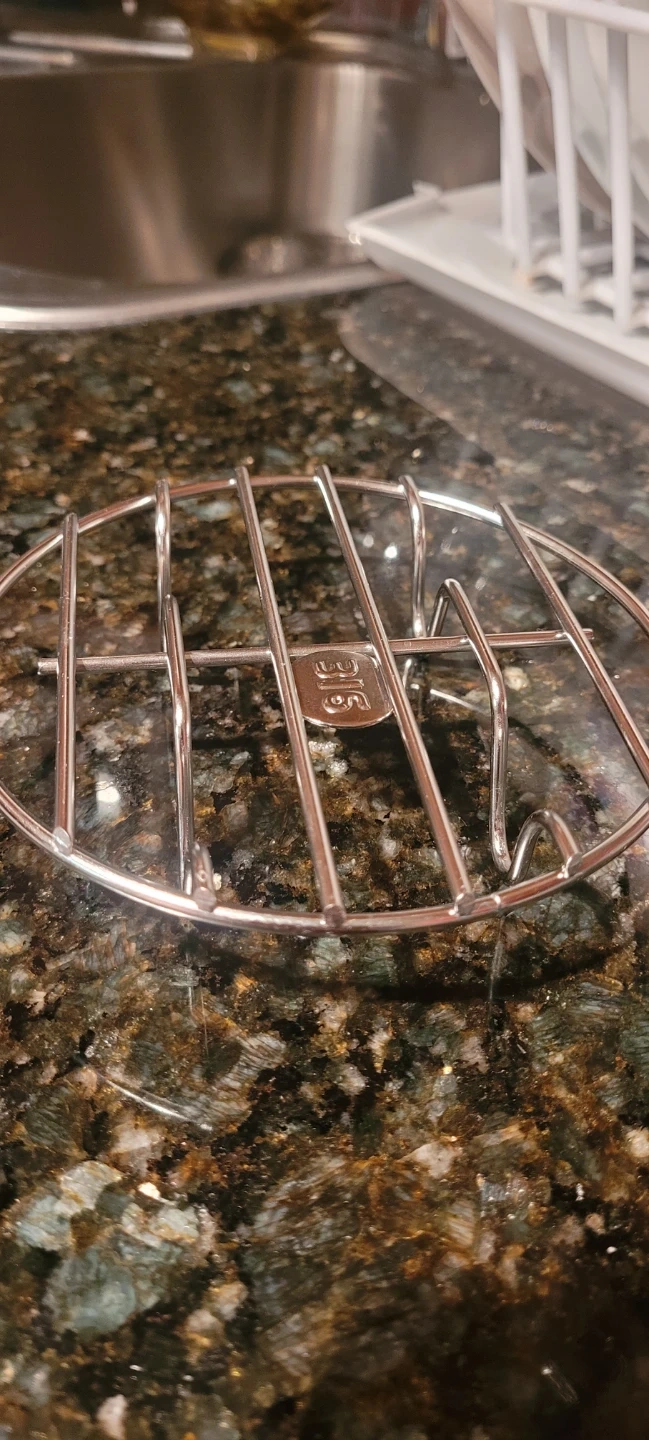 This is a stainless steel steamer. It's made from 316 stainless steel. It's round and has a slatted design