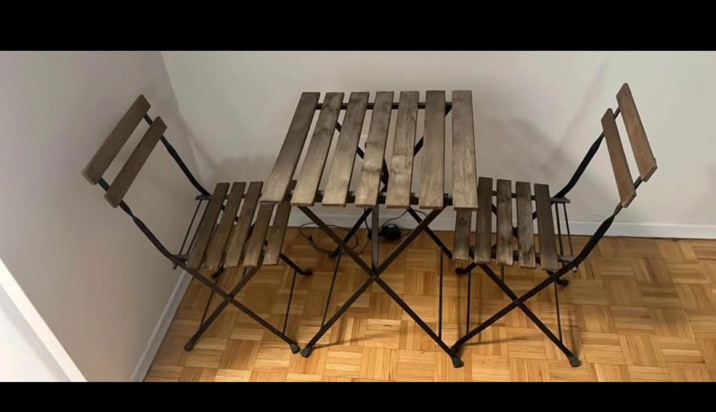 Outdoor bistro set, includes table and two chairs. Black metal frame, light brown stained wood. Foldable for easy storage.