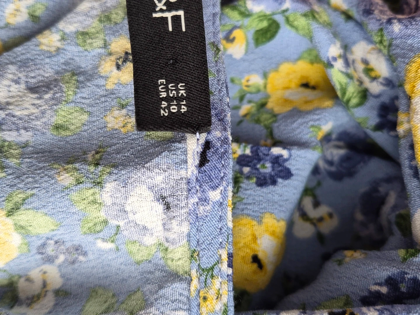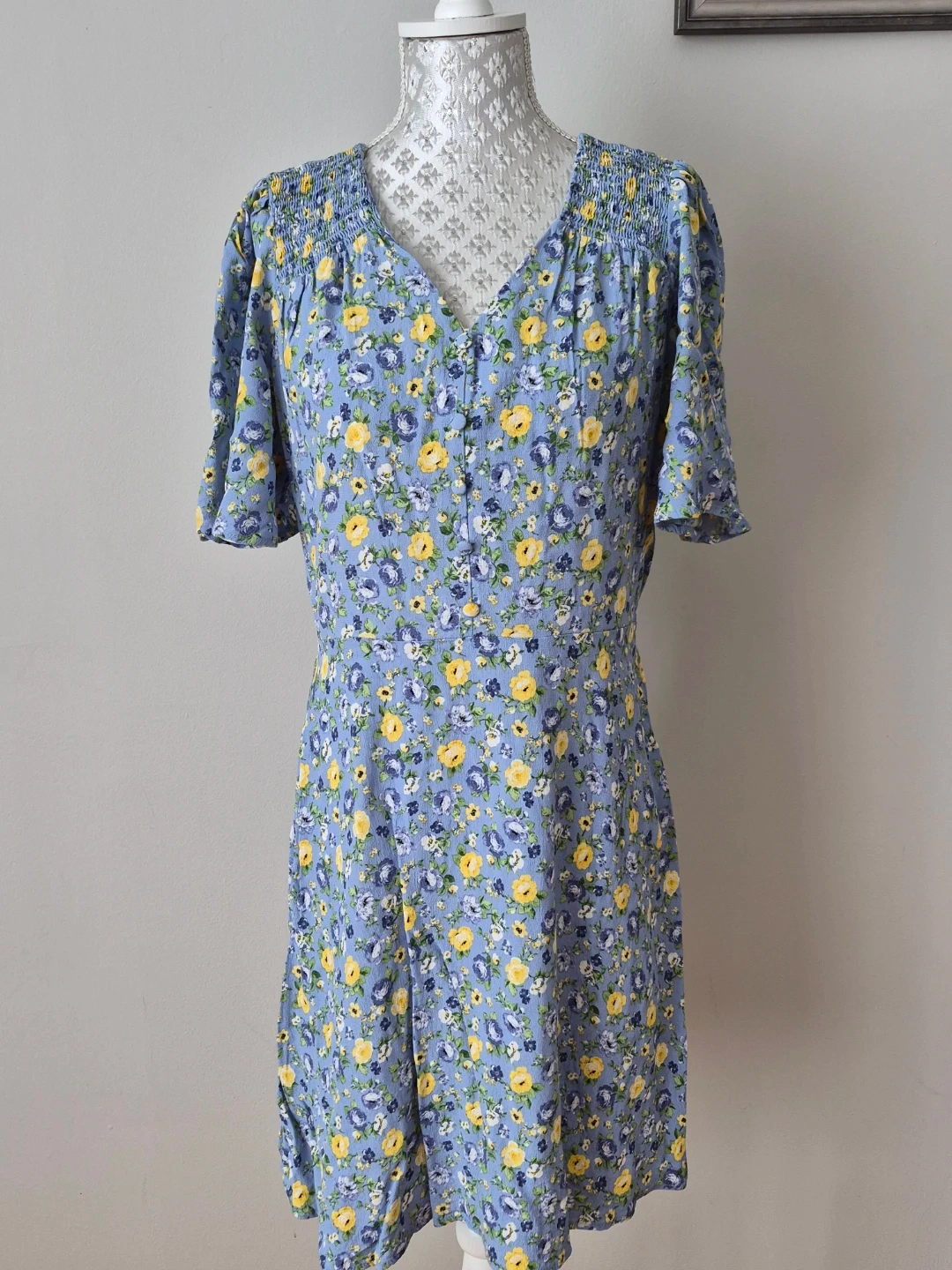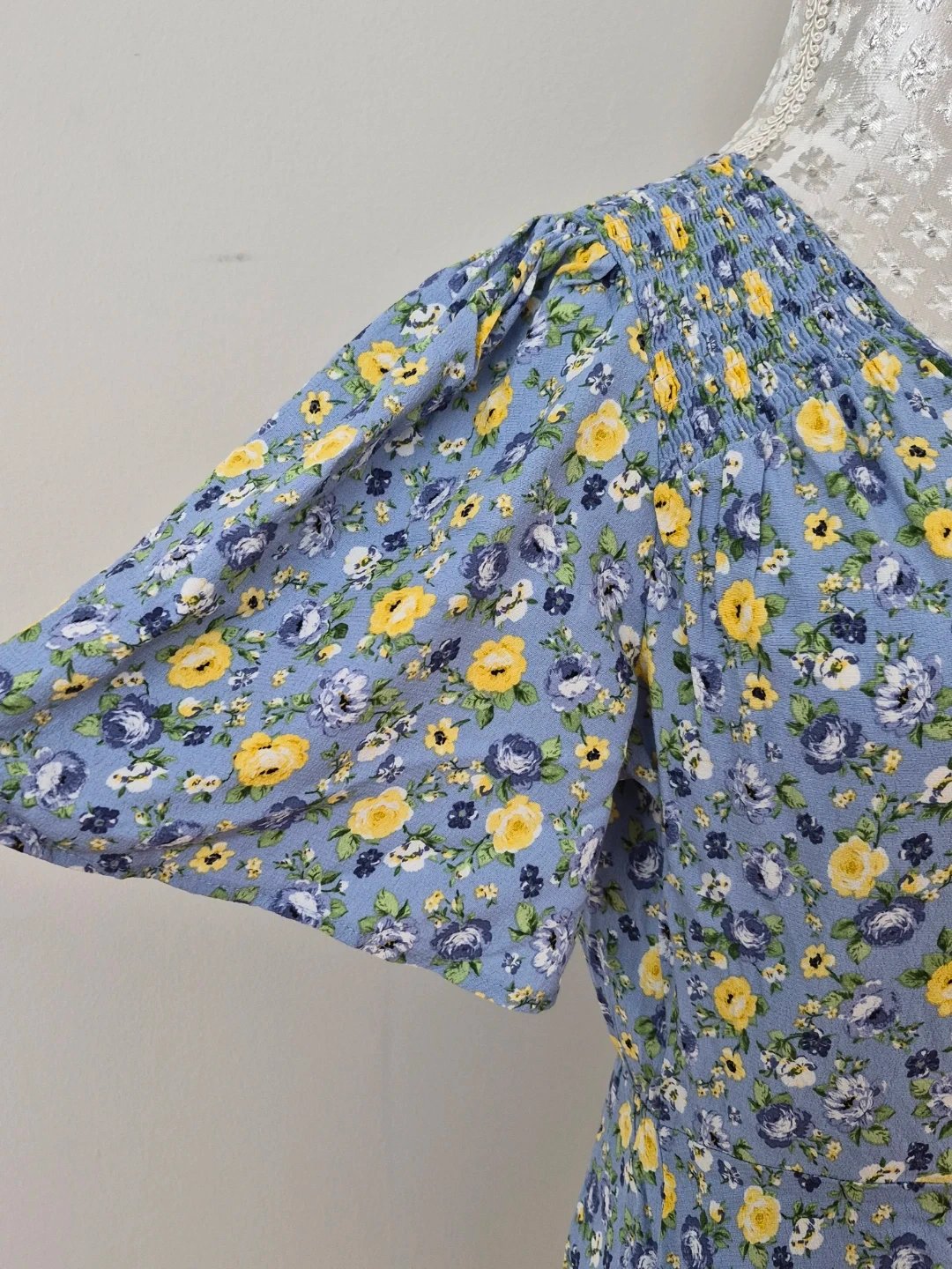 This light blue dress features a cheerful floral print with yellow and purple blossoms. It has short, fluttery sleeves and a shirred neckline. T
