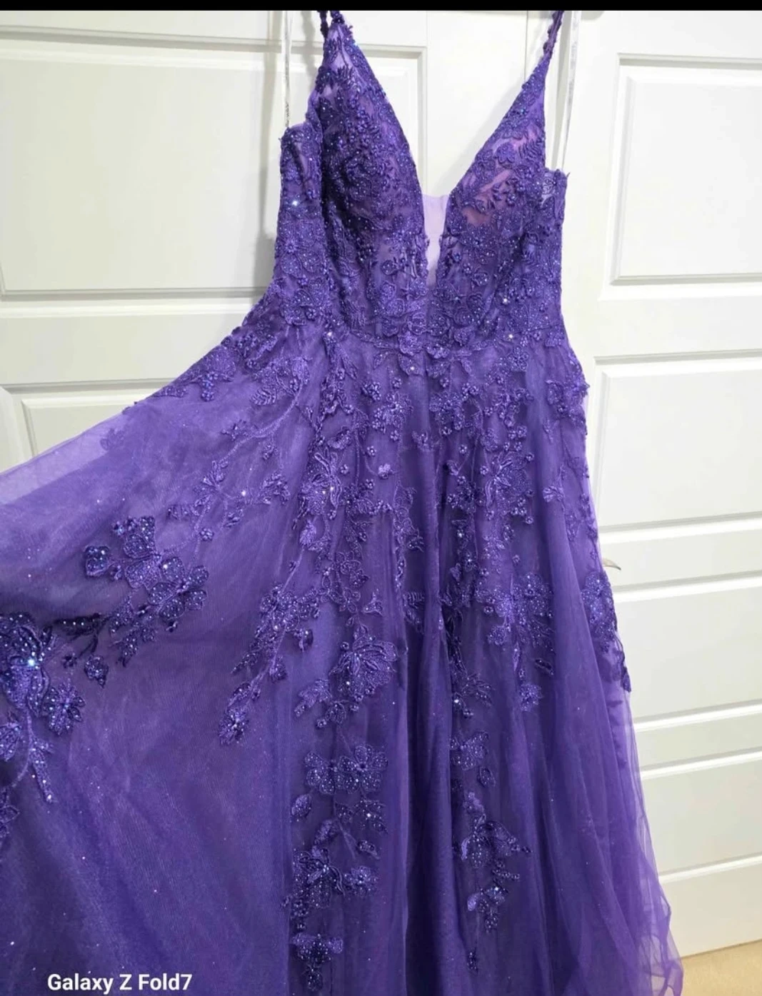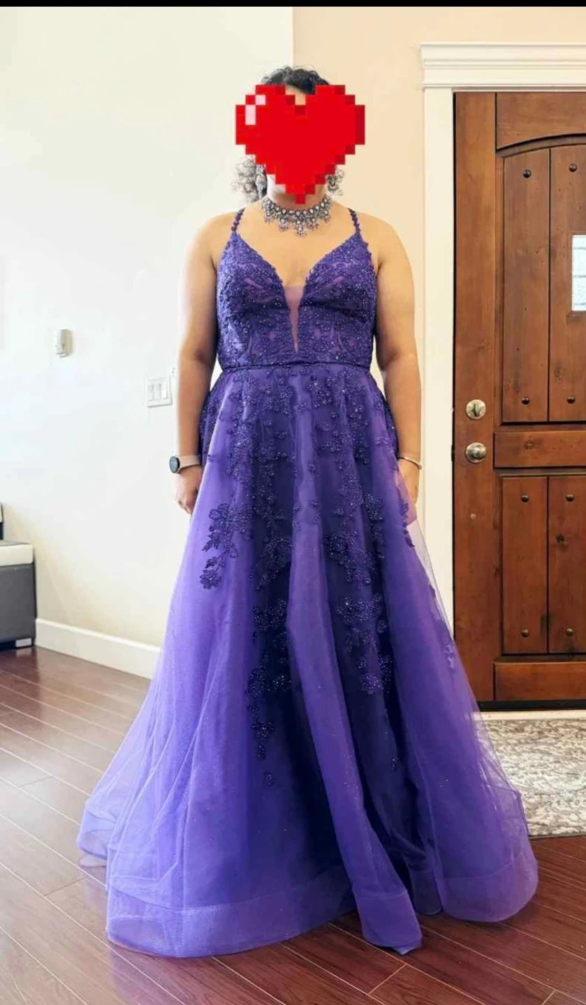 This stunning purple prom dress features intricate beaded lace detailing throughout. It has a flattering V-neckline and a full A-line skirt made of delicate tulle. Perfect for a formal event or graduation!