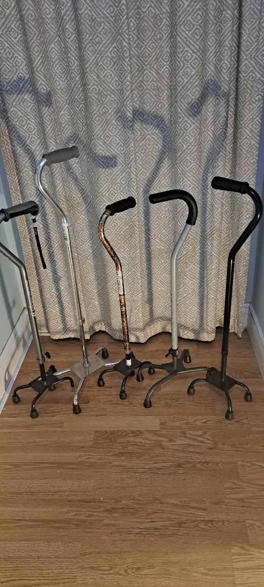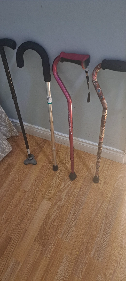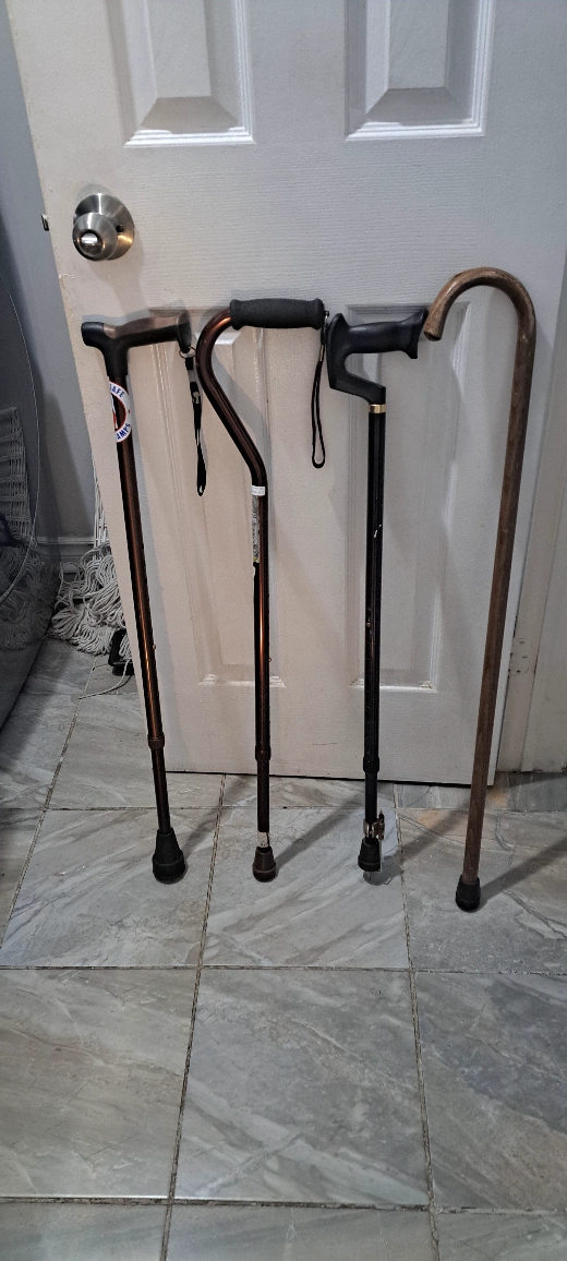 A collection of canes, including adjustable, folding, and wooden canes. All canes are in good condition.