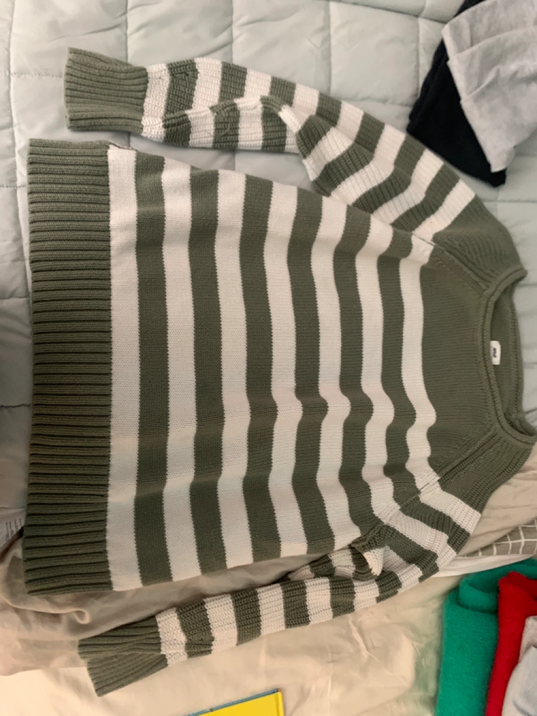 A cozy striped sweater with long sleeves, featuring a classic green and white stripe pattern. It's made from a soft knit material. This sweater is great for layering during cooler weather.