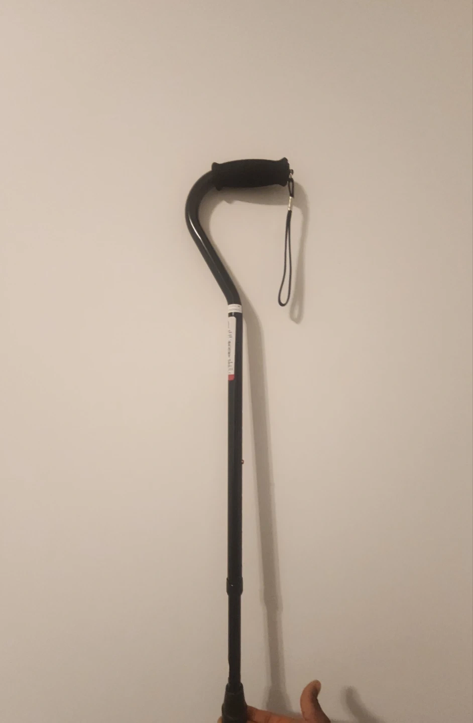 This is a black, adjustable walking cane with an offset handle and a wrist strap. It's designed for stability and comfort. The cane is height adjustable to suit your needs.