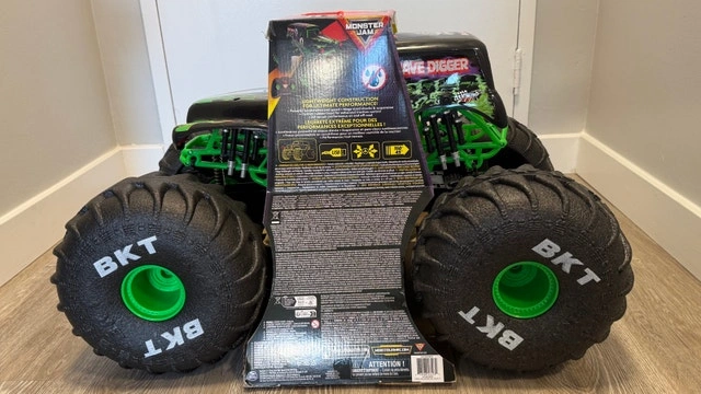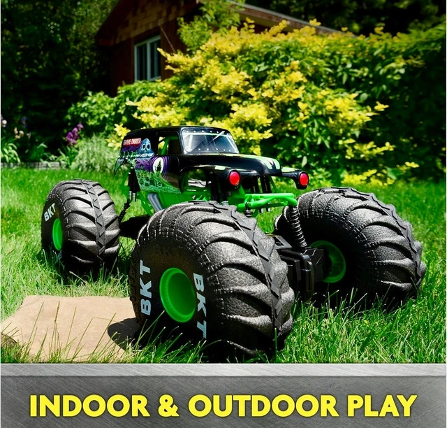 This is the BIGGEST RC Grave Digger ever, over 2-feet long! It's larger, faster, and more powerful than other Grave Digger RCs. You can control it from up to 250 feet away with the dual joystick controller and drive it in any direction. It's designed to drive over any obstacle, on or off-road, thanks to its lightweight design and huge tires. With rubber treads, mega-sized shocks, and suspension, this RC monster truck can tackle anything. It's an official Grave Digger replica with authentic graphics, oversized BKT Tires, and working lights. It features a built-in USB charging cable. This is a top gift for kids aged 4 and up. Requires 2 AAA batteries for the remote control (not included). Let me know if you're interested!