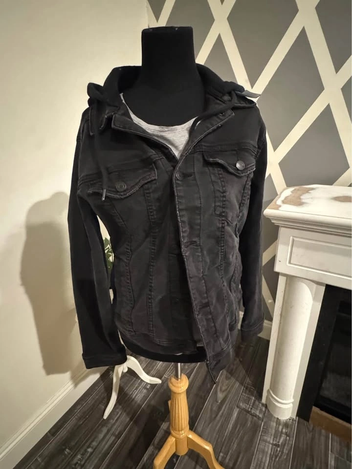 hollister black denim jacket with hoodie (size xs)