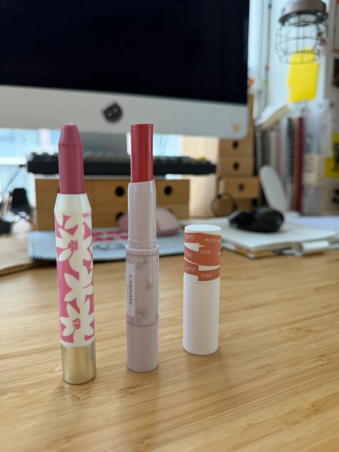 Three lipsticks from Canmake and Origins. Includes one Canmake lipstick and one Origins Kissing lipstick and one Intoyou lipstick.