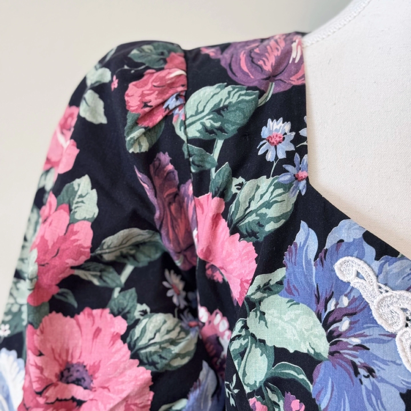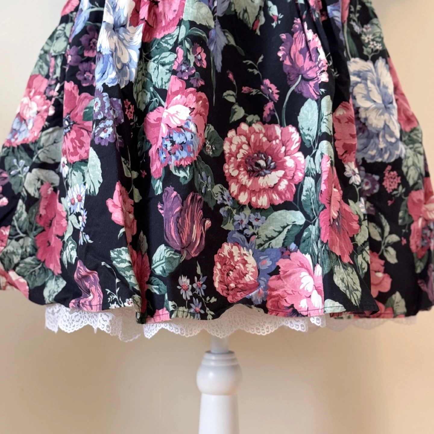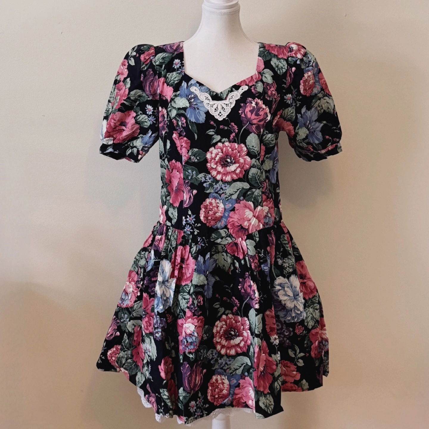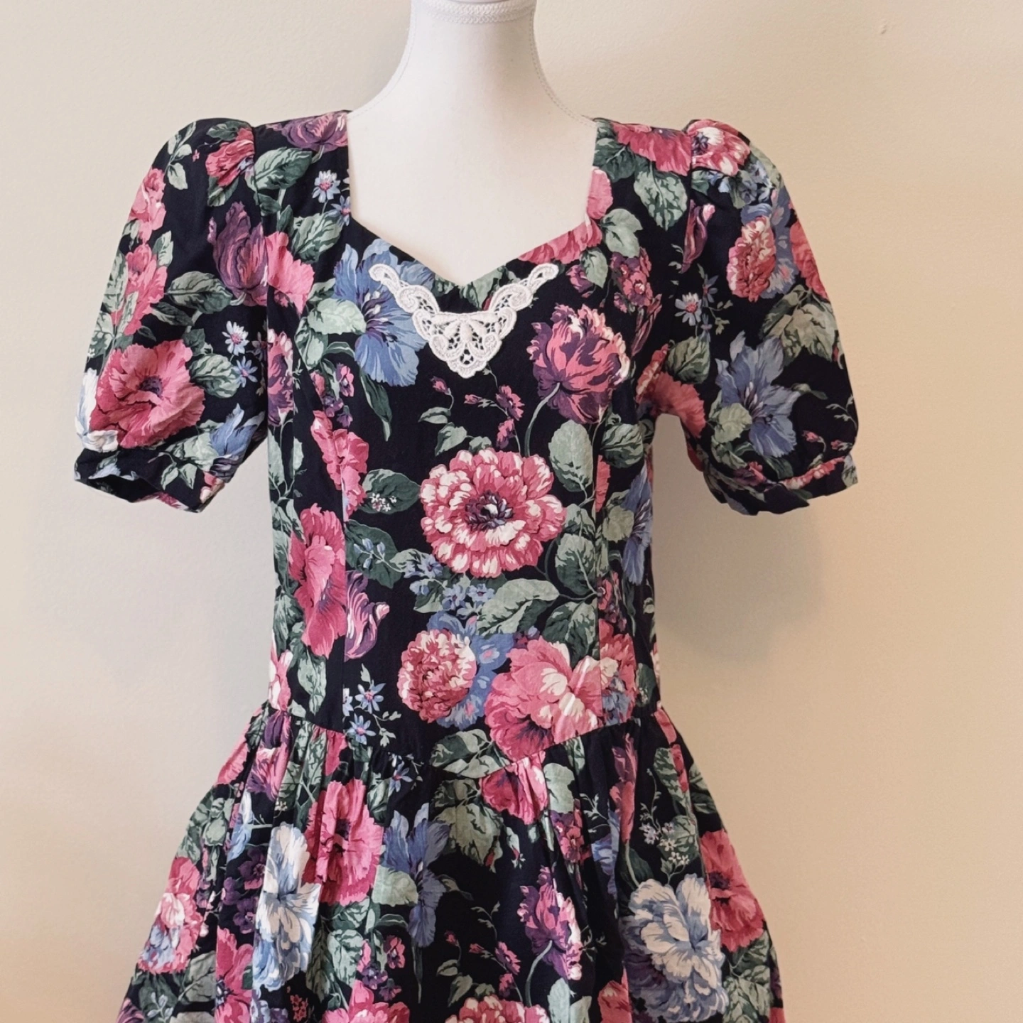 A charming vintage dress featuring a romantic floral print on a black background. Designed with a sweetheart neckline and delicate lace detail, this dress exudes cottagecore elegance. The puff sleeves and fitted waist create a flattering silhouette, while the gathered skirt adds a touch of femininity.