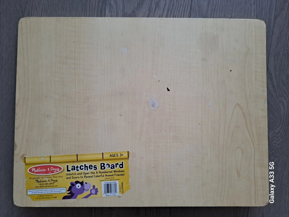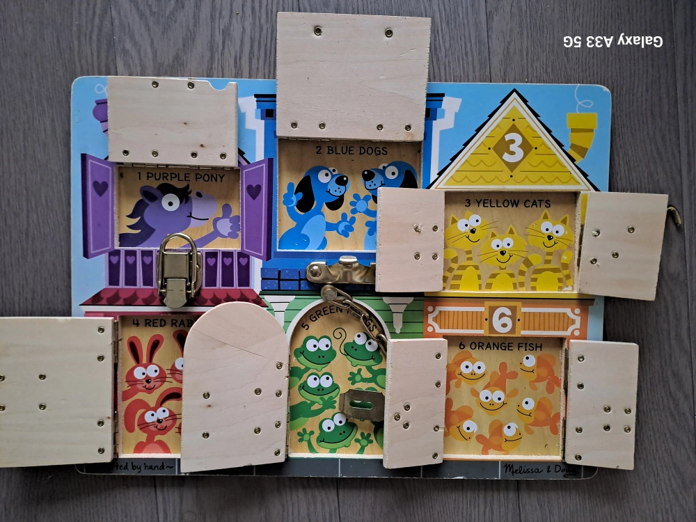 Wooden latch board. Six doors and windows with various latches. Includes colourful animal pictures.