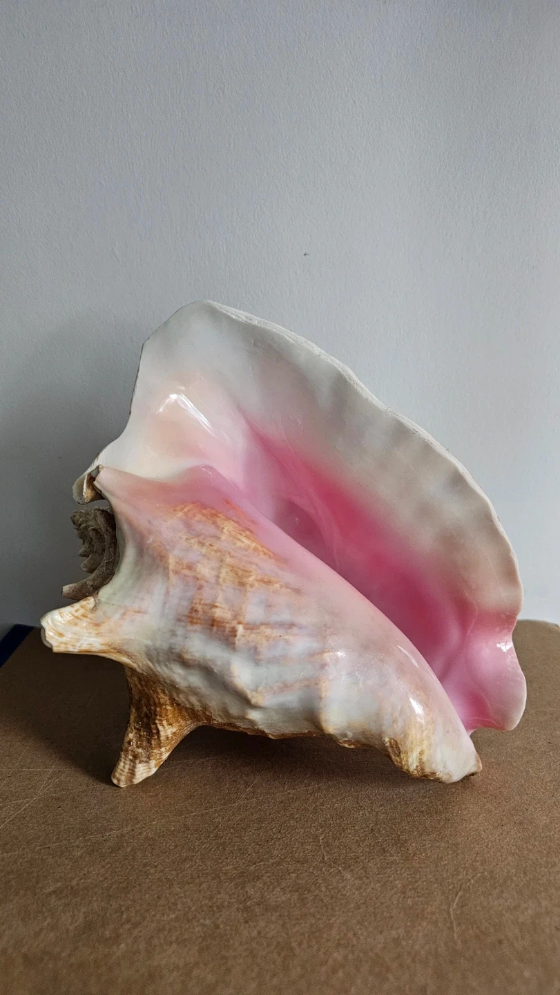 A beautiful, large conch shell with pink and white interior. It's a natural seashell, perfect for home decor or collecting.