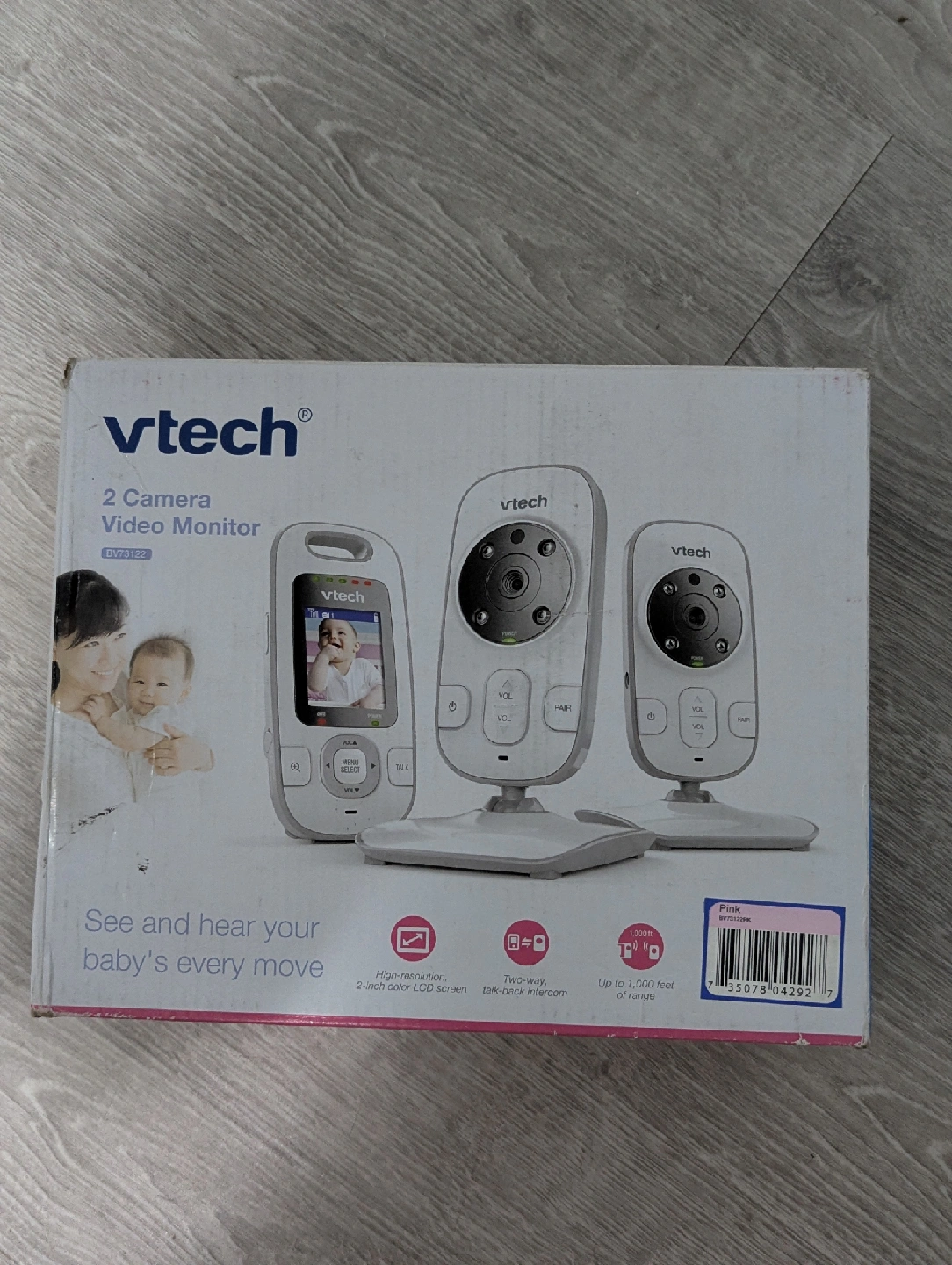 10Selling a VTech 2-camera video baby monitor. It comes with all the components and the original box. See and hear your baby's every move with this high-resolution monitor. It features a 2-inch colour LCD screen and offers two-way talk-back intercom functionality. It also has a range of up to 1,000 feet. Great for keeping an eye on your little one!