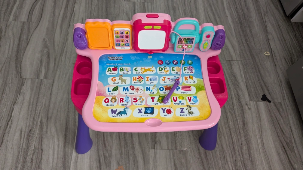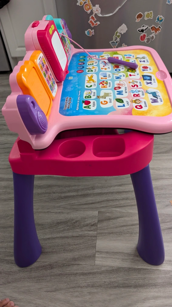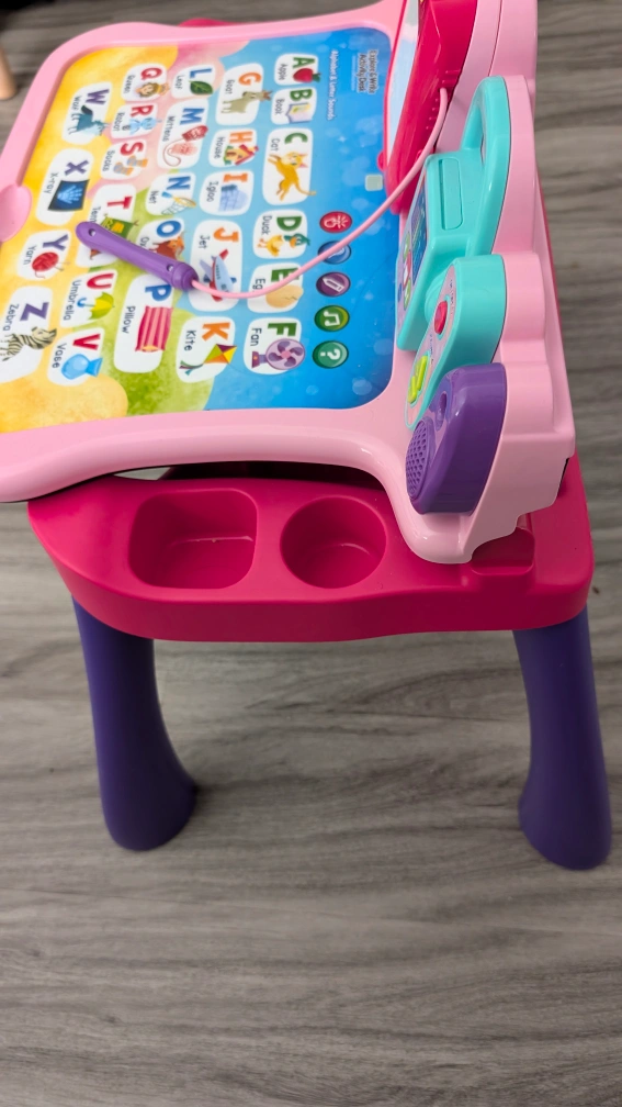 I'm using ShopBroker! It's a new service in Vaughan that allows any seller to add secure payment and delivery to their transactions. Order now for $20 including delivery: https://shopbroker.ca/transaction/27b71d17 Interactive Learning Activity Desk Pink Purple from VTech's educational toy collection. This colorful learning station features pink and purple styling with multiple built-in interactive components including phone, tablet, and whiteboard elements. • Complete activity desk with removable legs • Built-in interactive phone and tablet components • Integrated whiteboard surface for drawing • Purple stylus/pen included for writing activities • Multiple interactive buttons and sound elements • Pink and purple color scheme design Originally retailed for around $80 CAD. This unit is in good condition with overall good condition with normal play wear, colors remain vibrant, all interactive elements appear functional, minor scuffs on plastic surfaces consistent with use, no visible cracks or damage to main structure. It includes purple stylus/pen, 3 activity sheets, complete activity desk with legs, all built-in interactive elements (phone, tablet, whiteboard, etc.).