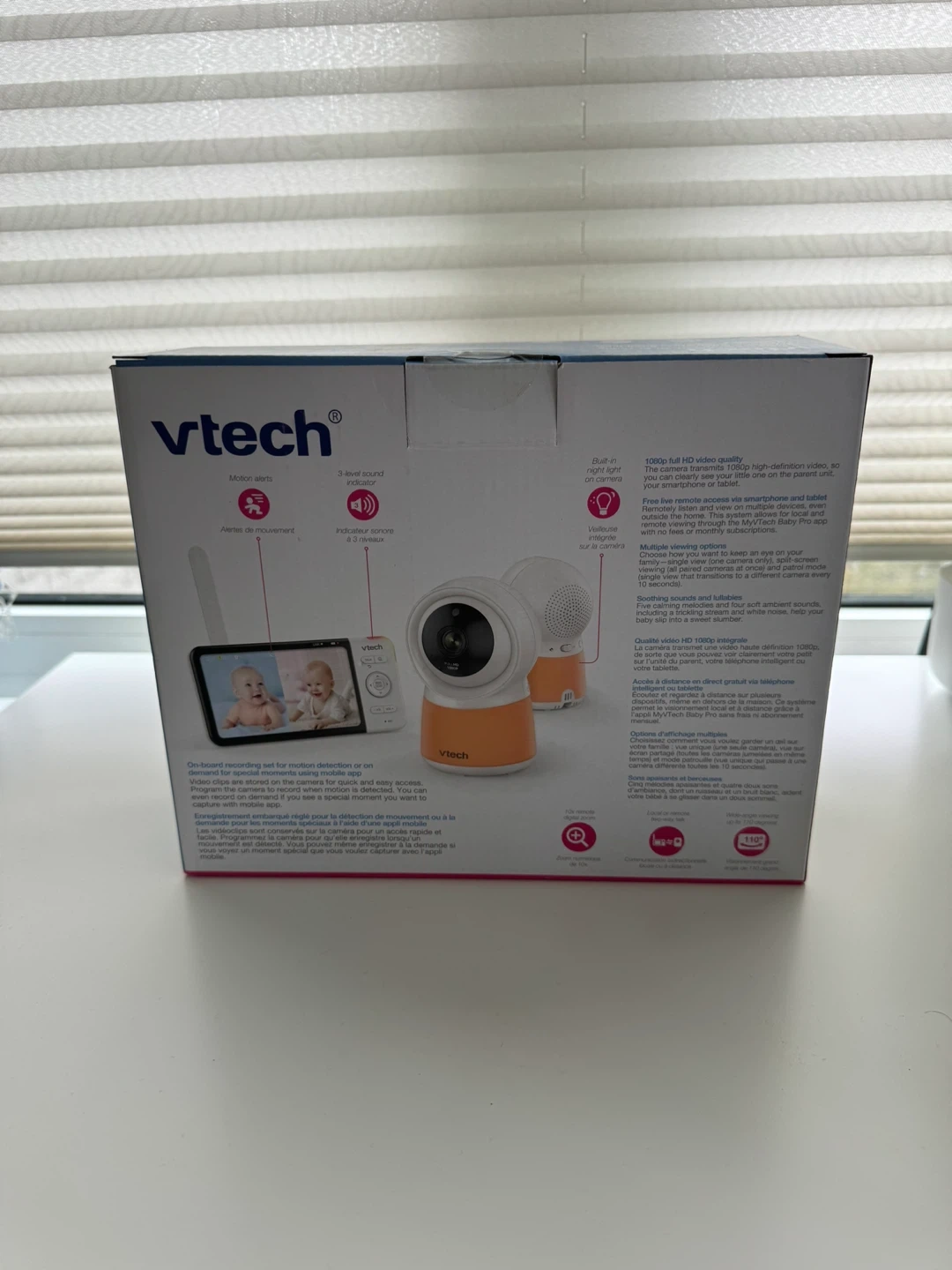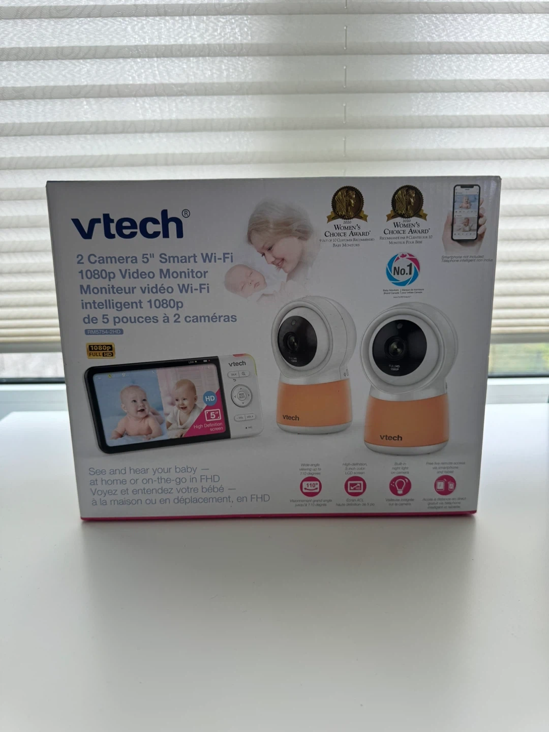 5Selling a VTech 2 Camera Video Monitor. It comes two 5” intelligent cameras with 1080p video quality and built in night light. The cameras rotate 110 degrees. Free live remote access via smartphone and tablet. See and hear your baby at home or on-the-go in FHD! This item is new and has never been opened.