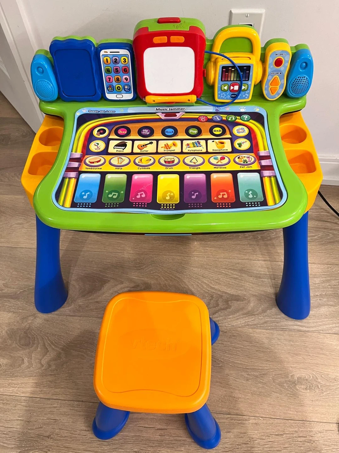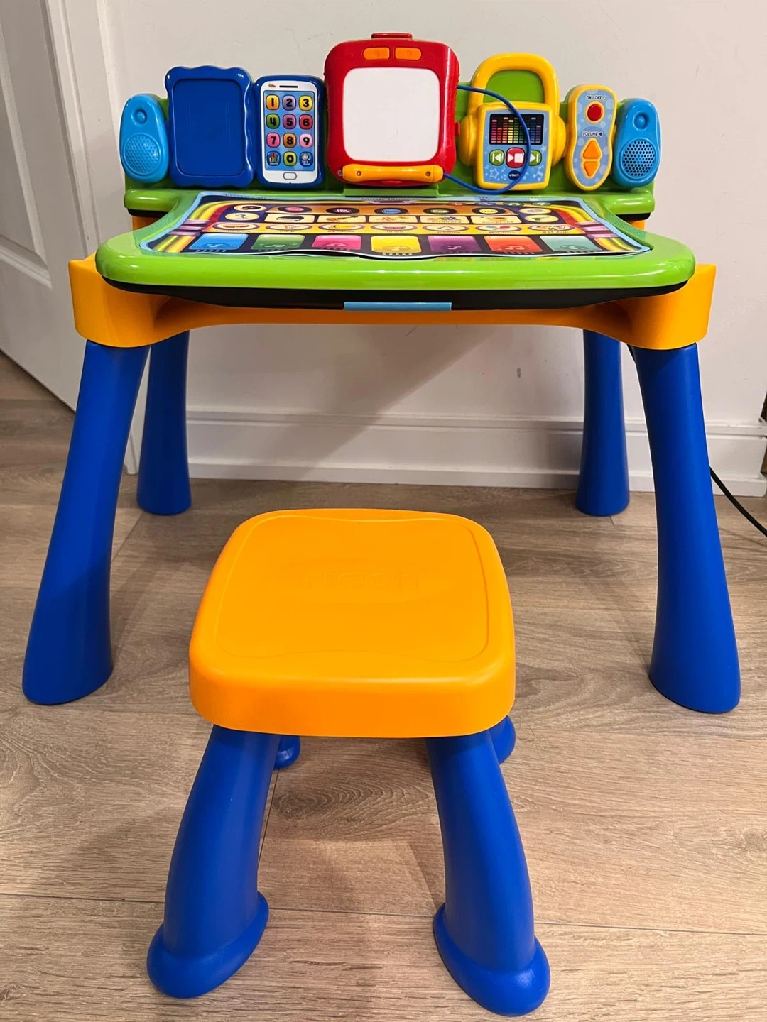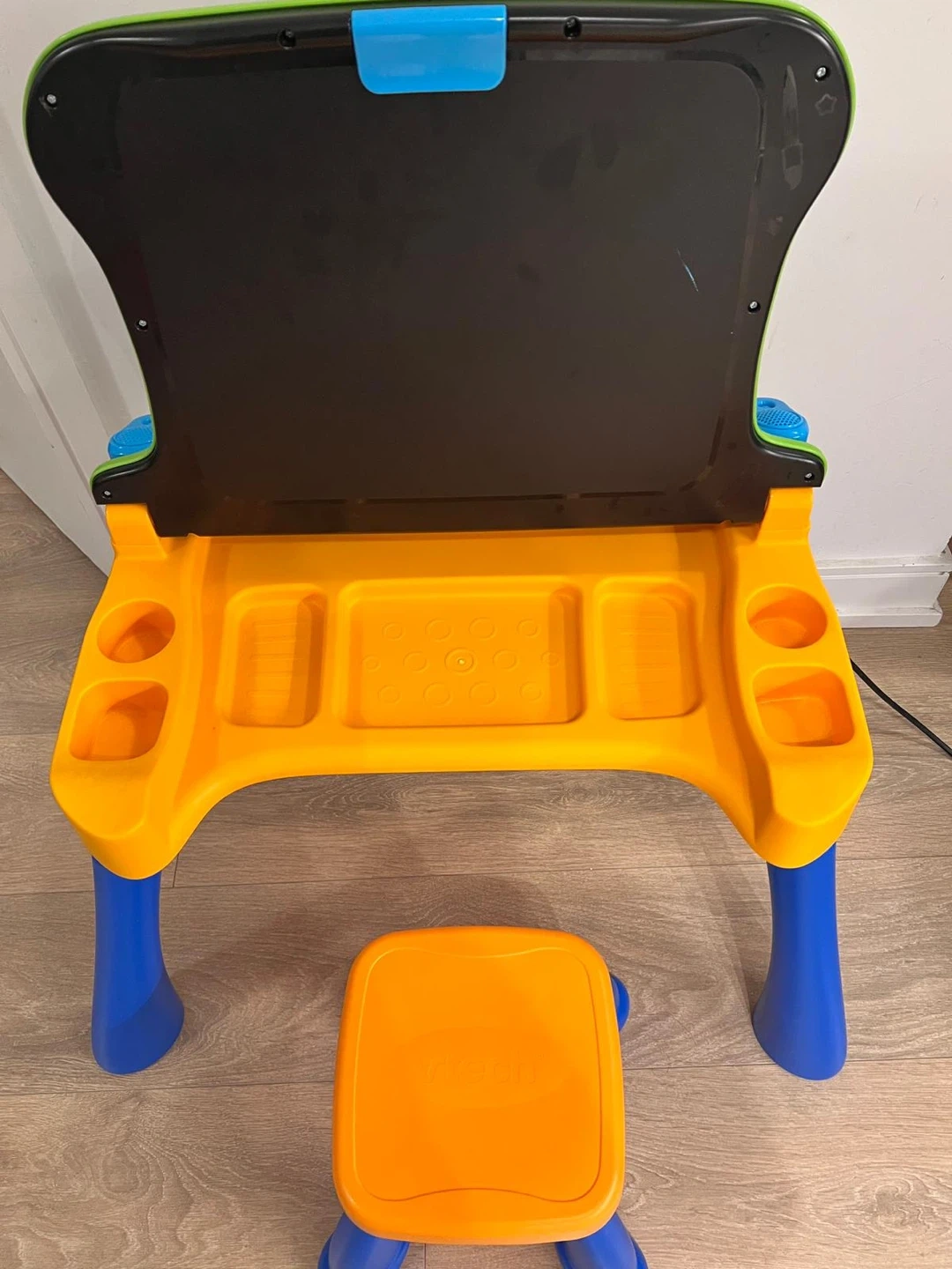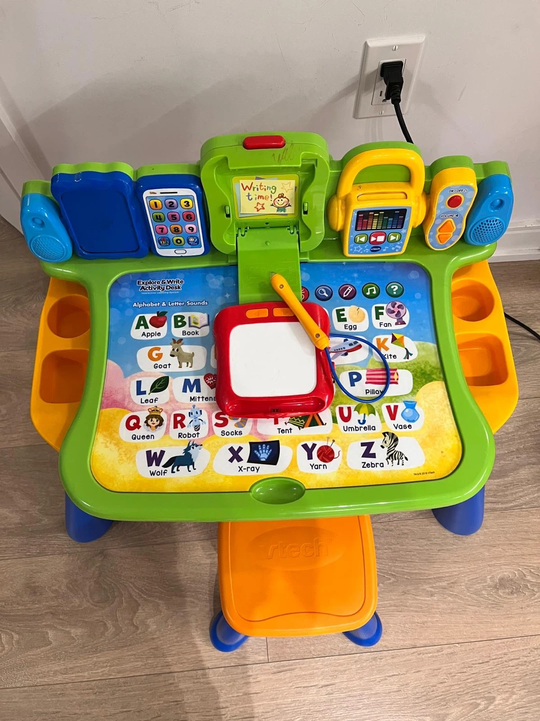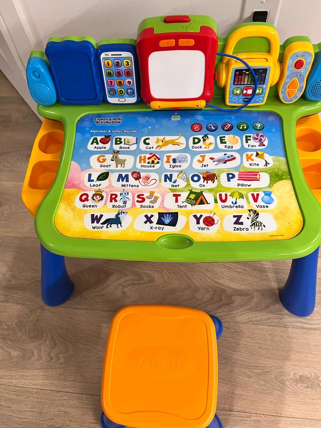 The VTech Explore & Write Activity Desk is perfect for little learners! It comes with a stool, so your child can sit comfortably while they play and learn. The desk features interactive learning activities that teach letters, numbers, and more. Writing pad with LED screen becomes writing pad with stylus; children can trace letters, numbers, and shapes with proper stroke order. Transforms from a desk into an easel and chalkboard with storage space for art supplies to encourage creative play. Includes a toy telephone with number pad for role-play fun; music player includes 20+ melodies.
