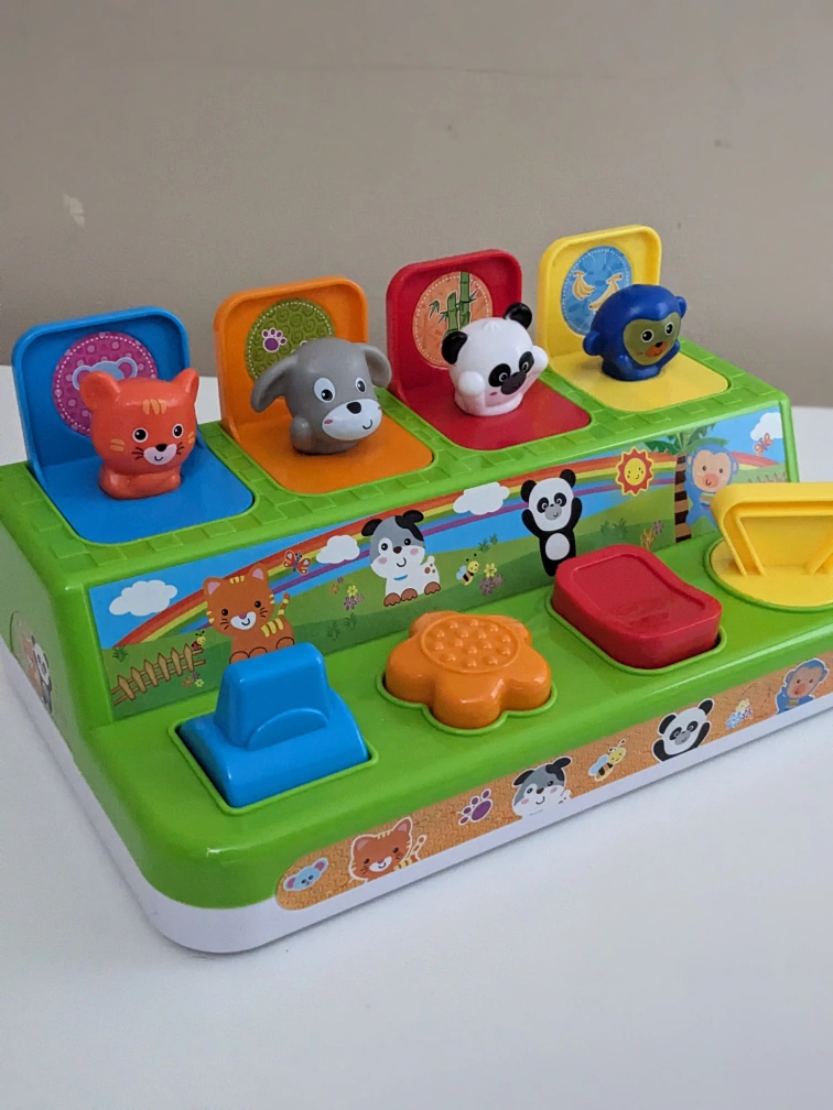 14Four animal characters that pop up. Good for hand-eye coordination and fine motor skills. SFPF home.