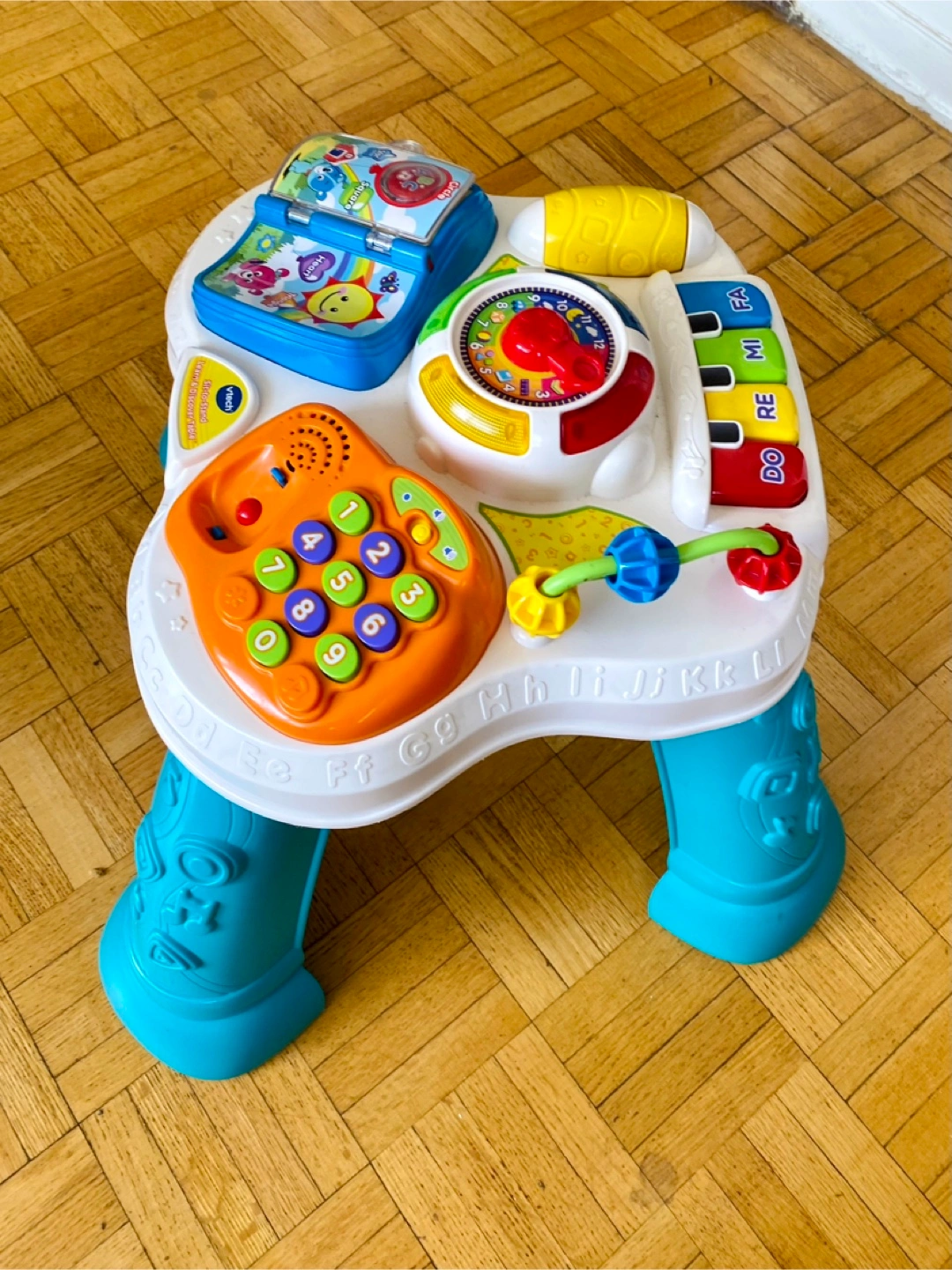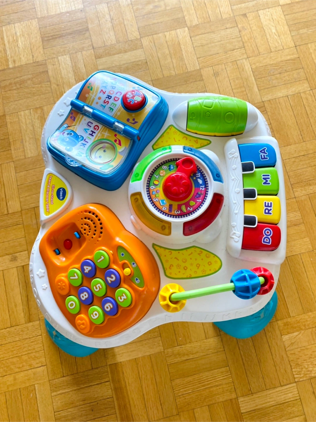 Interactive learning centre. Features include a piano, phone, number pad, and rotating activity centre. Great for toddlers. Pickup from Yonge and college