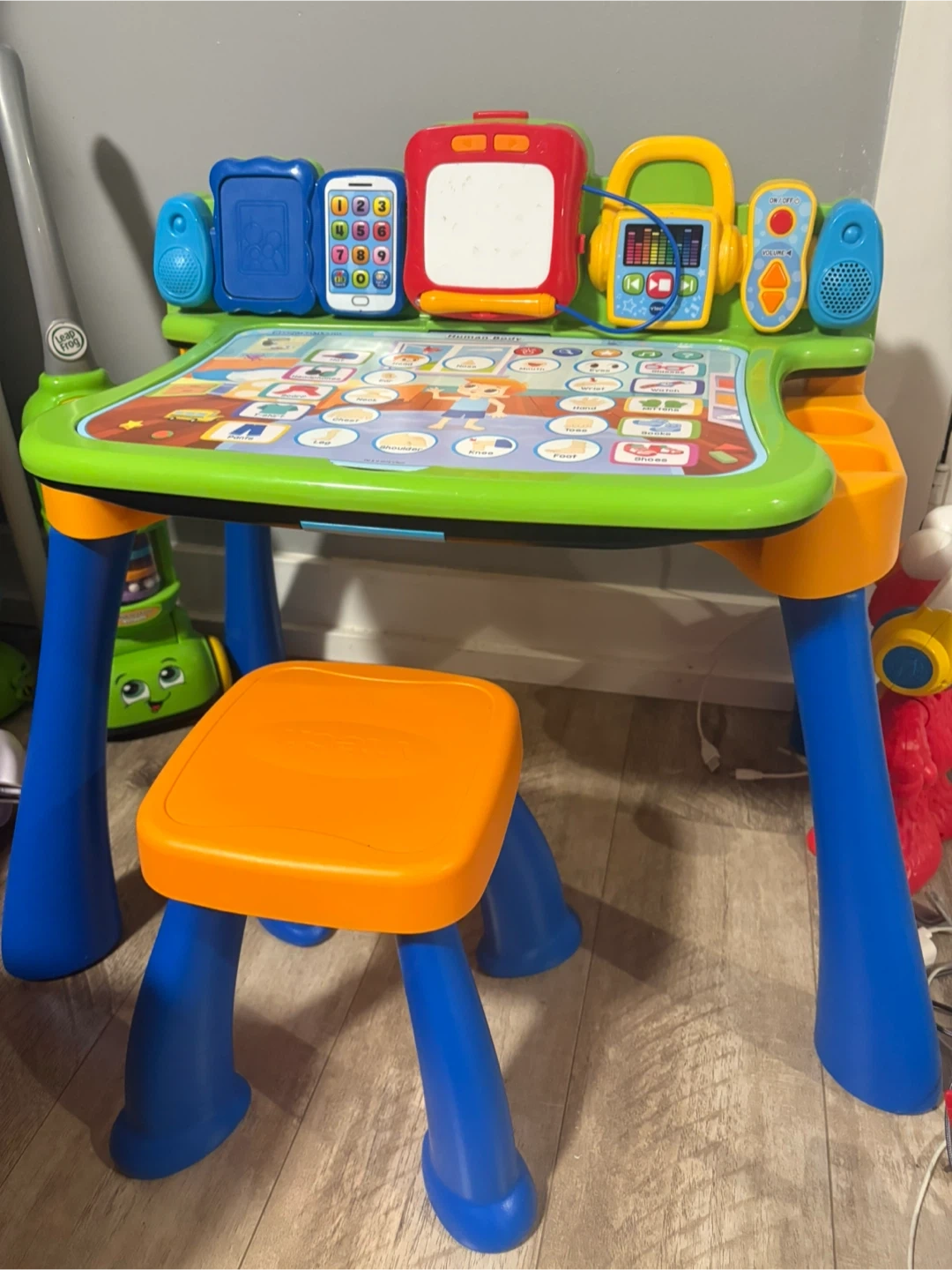 Selling a Smart Adventures table with a chair. This interactive learning table is perfect for toddlers and preschoolers. It features various learning activities, including letters, numbers, shapes, and colours. The table also comes with a chair, making it a complete set for your little one's learning adventures