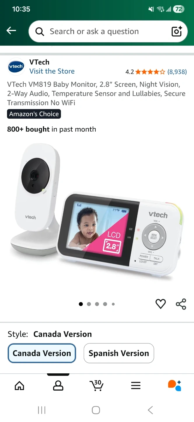 65Selling a VTech VM819 baby monitor with a 2.8" screen! It has night vision, 2-way audio, a temperature sensor, and lullabies. It also has secure transmission and no WiFi. It's the Canada Version! Only taken out of the box once to make sure it worked. Simple to use and easy set up