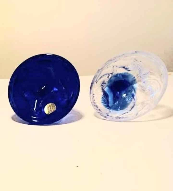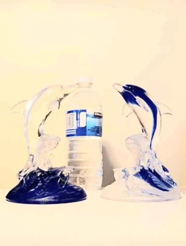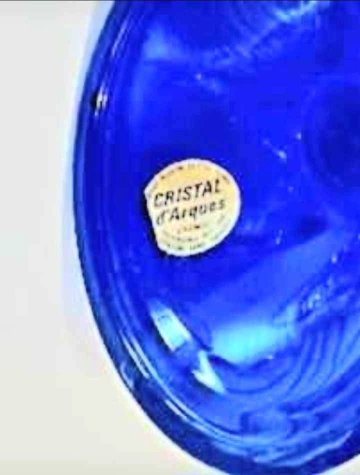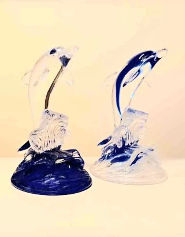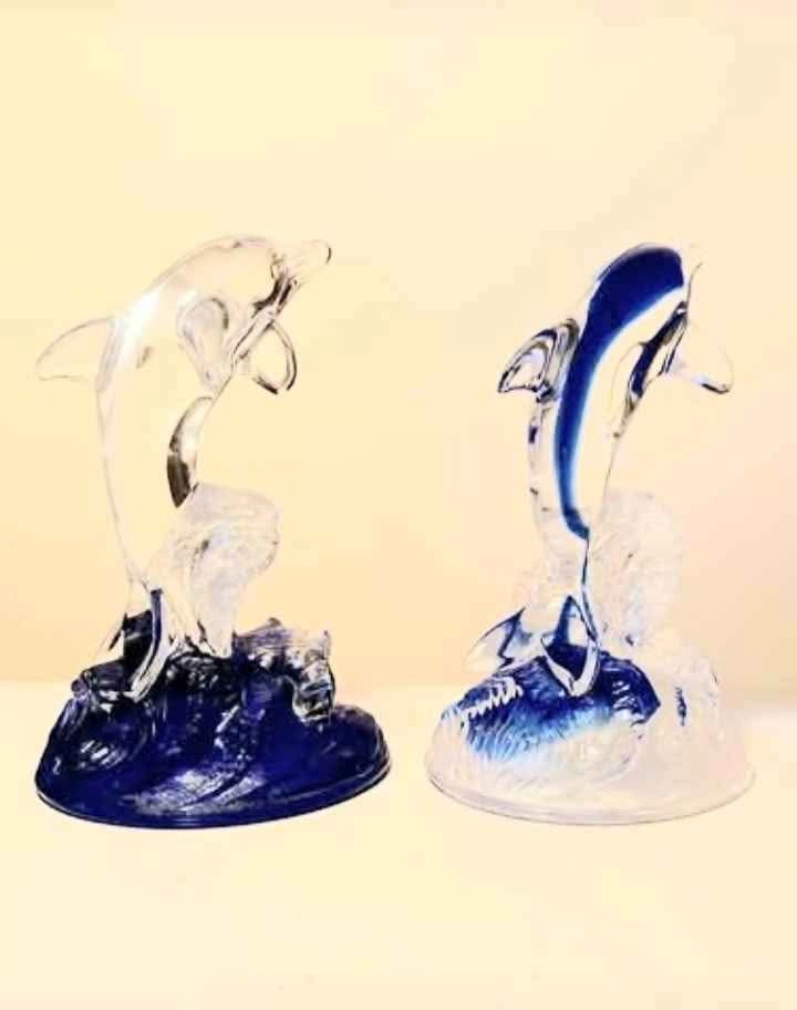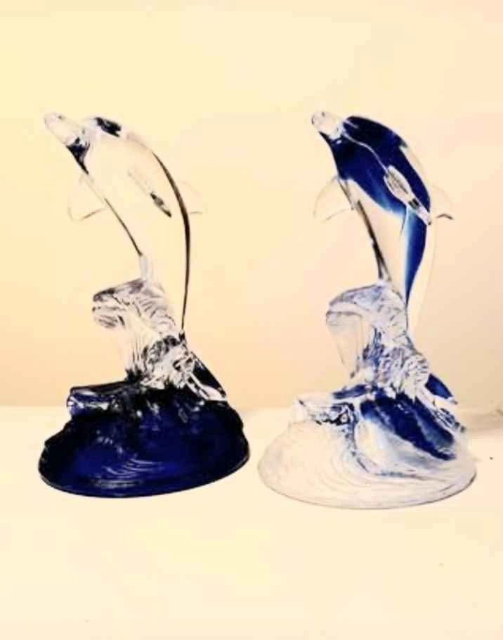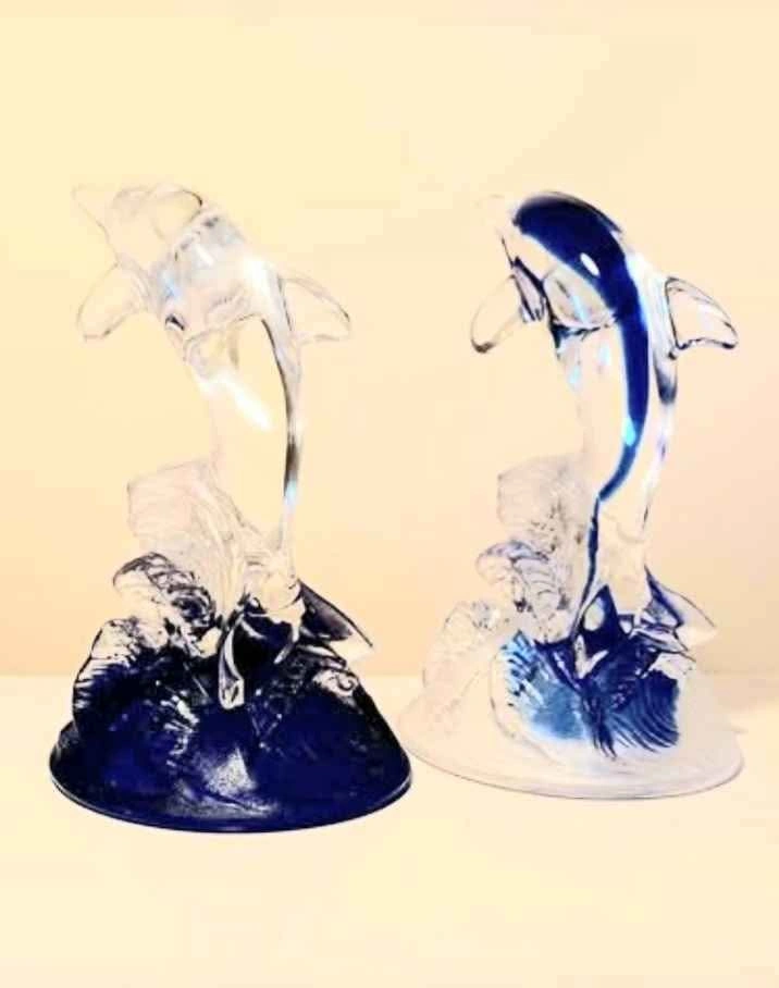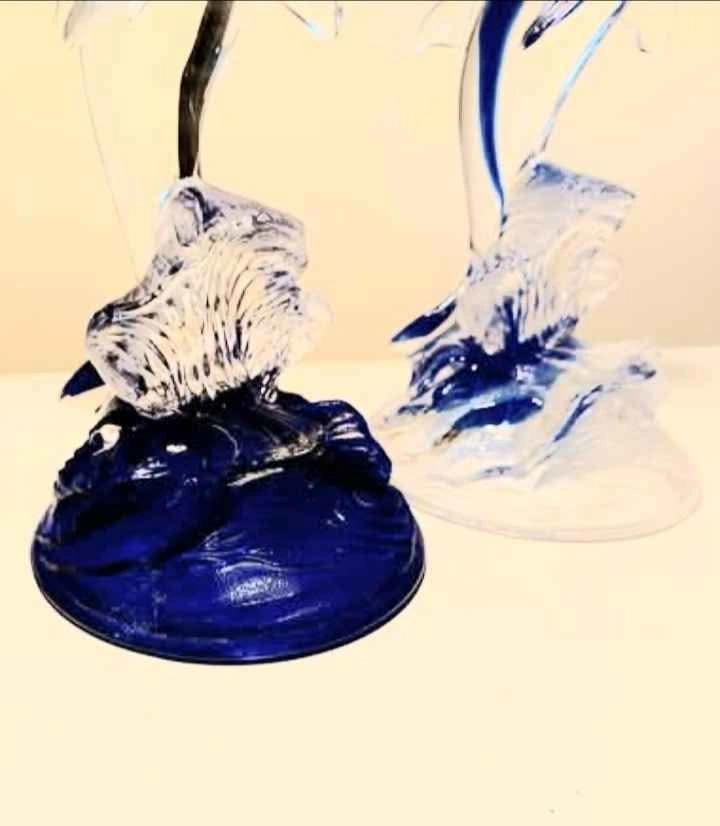 65Pair of Vintage, Collectible Cristal d'Arques 24% Lead Crystal glass Dolphin Figurines. Featuring clear and Cobalt Blue Glass depicting Dolphins Leaping Over Waves. Made by Cristal d'Arques, a renowned French glass manufacturer. Cobalt Blue glass is flashed through the dolphin and base, creating a vibrant effect and capturing the grace of the ocean. Decorative , Centerpiece, Household adding a touch of Elegance to any space. Excellent Condition, no chips or cracks. Please check out my other collectibles!