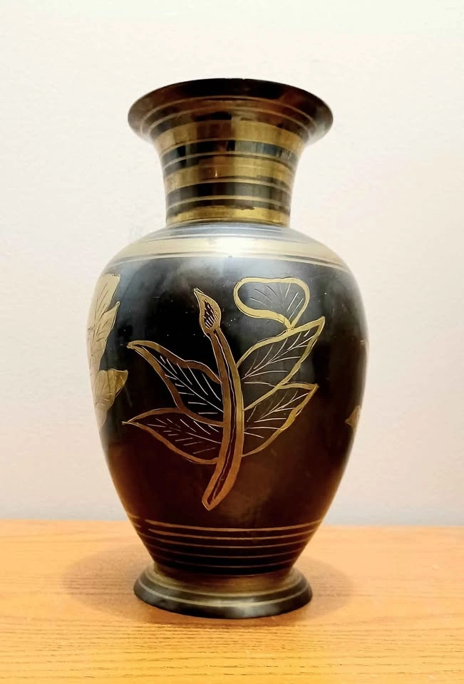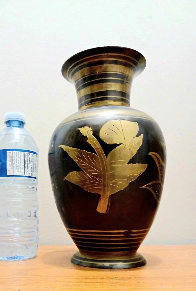65Vintage Mid Century Era , Hand Crafted Centerpiece , Etched Solid Brass Vase , with Black and Gold Etched Floral Design. Decorative, Household Displaying Flowers. Made in India Very Good Condition Please check out my other rare collectibles!