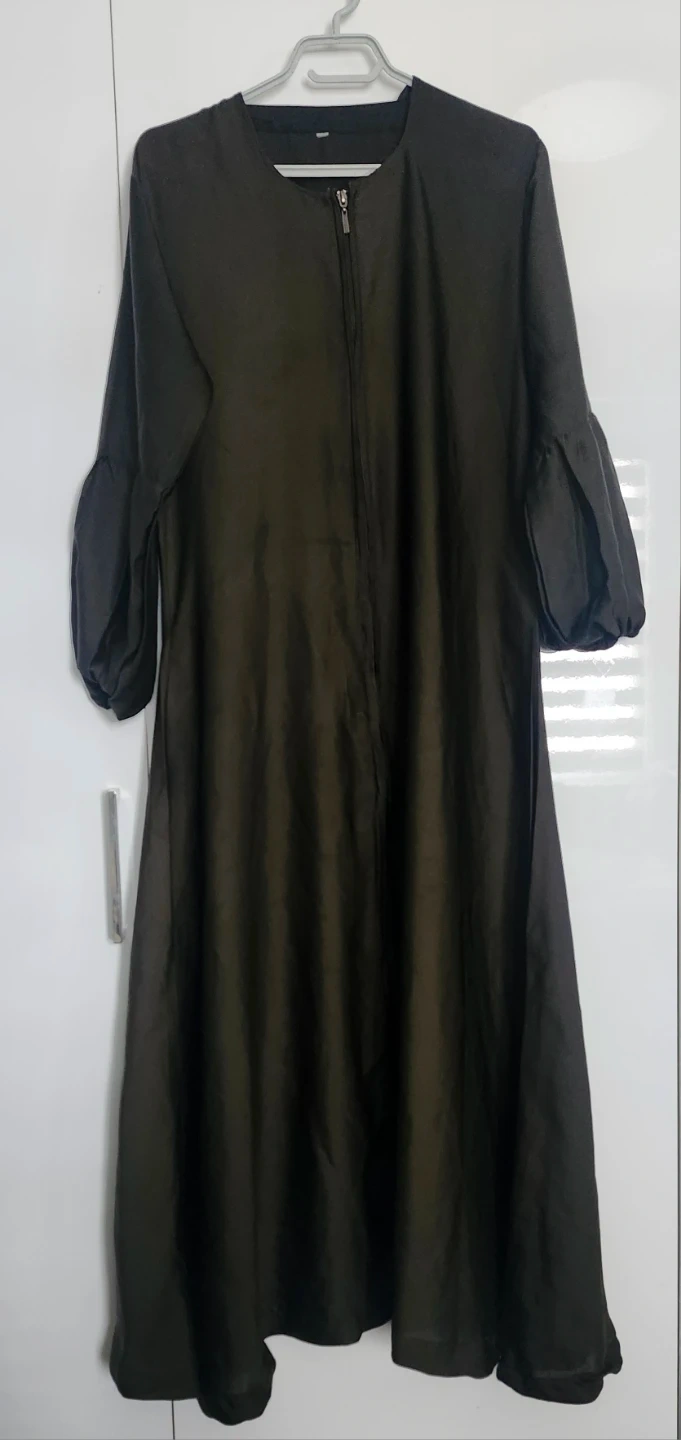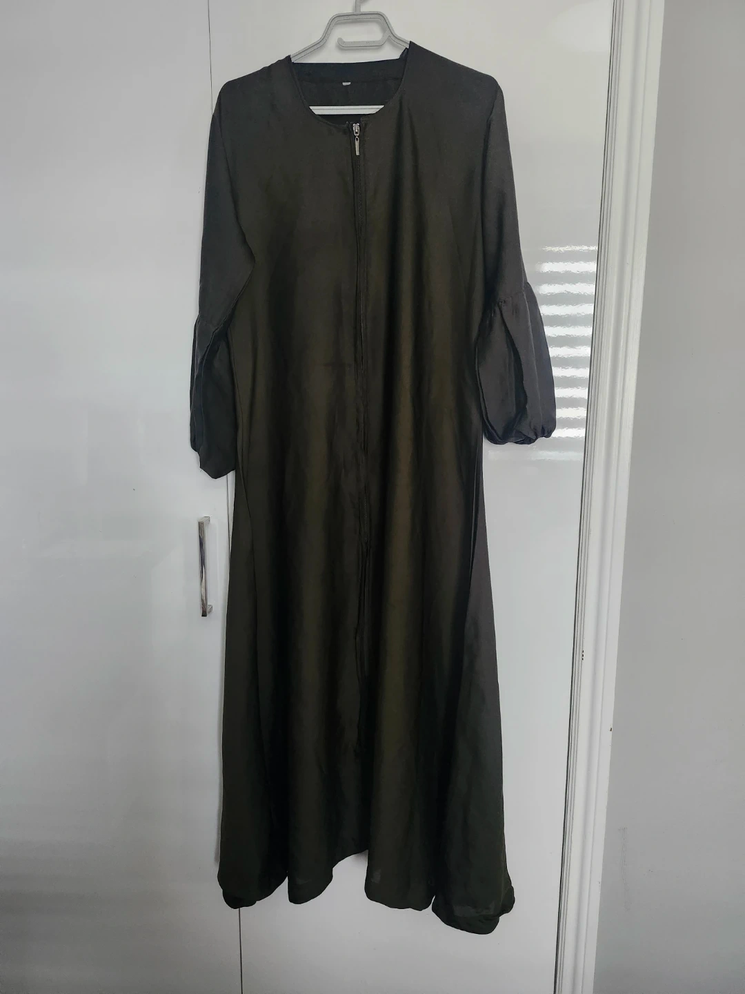 This is a lovely olive green Abaya. It's in great condition and ready for a new wardrobe! It has a zipper down the front and unique sleeves.