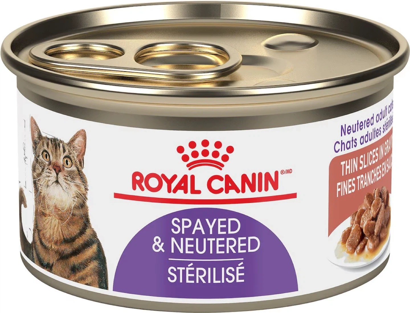 Royal Canin Feline Health Nutrition for spayed and neutered adult cats. Features thin slices in gravy. Net weight is 3.0 oz (85 g). 48 cans available.