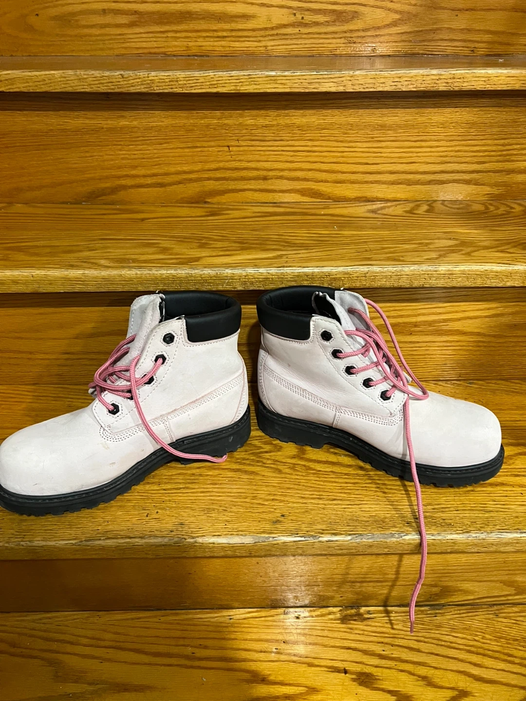 Moxie Trades work boots (steel toe) for women. Pink with black soles and pink laces. The soles are oil resistant. Boots are very gently used. Size 9