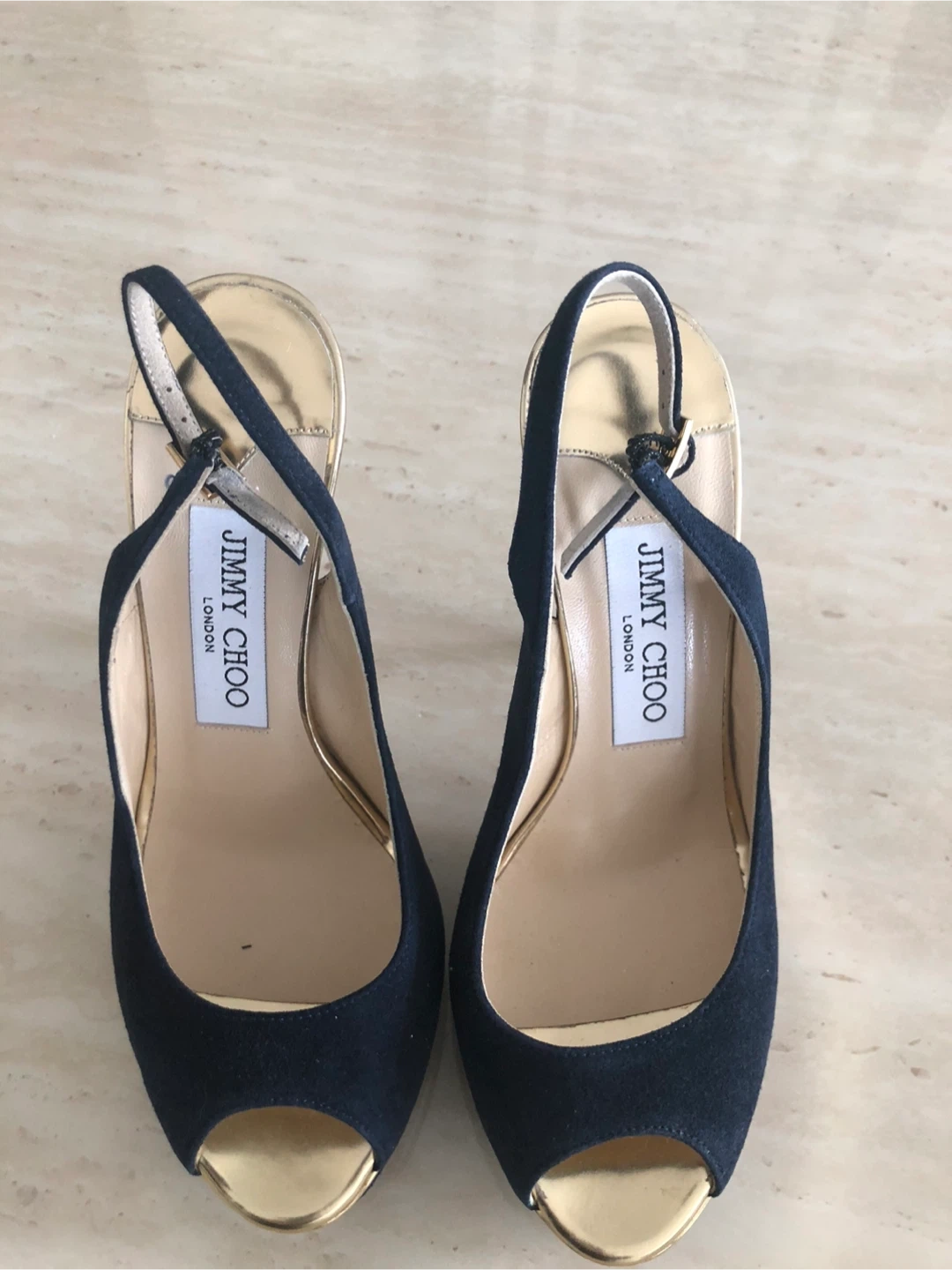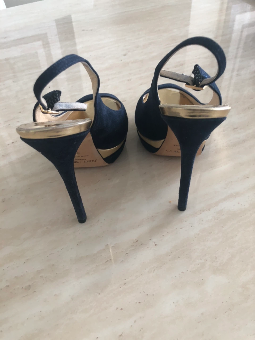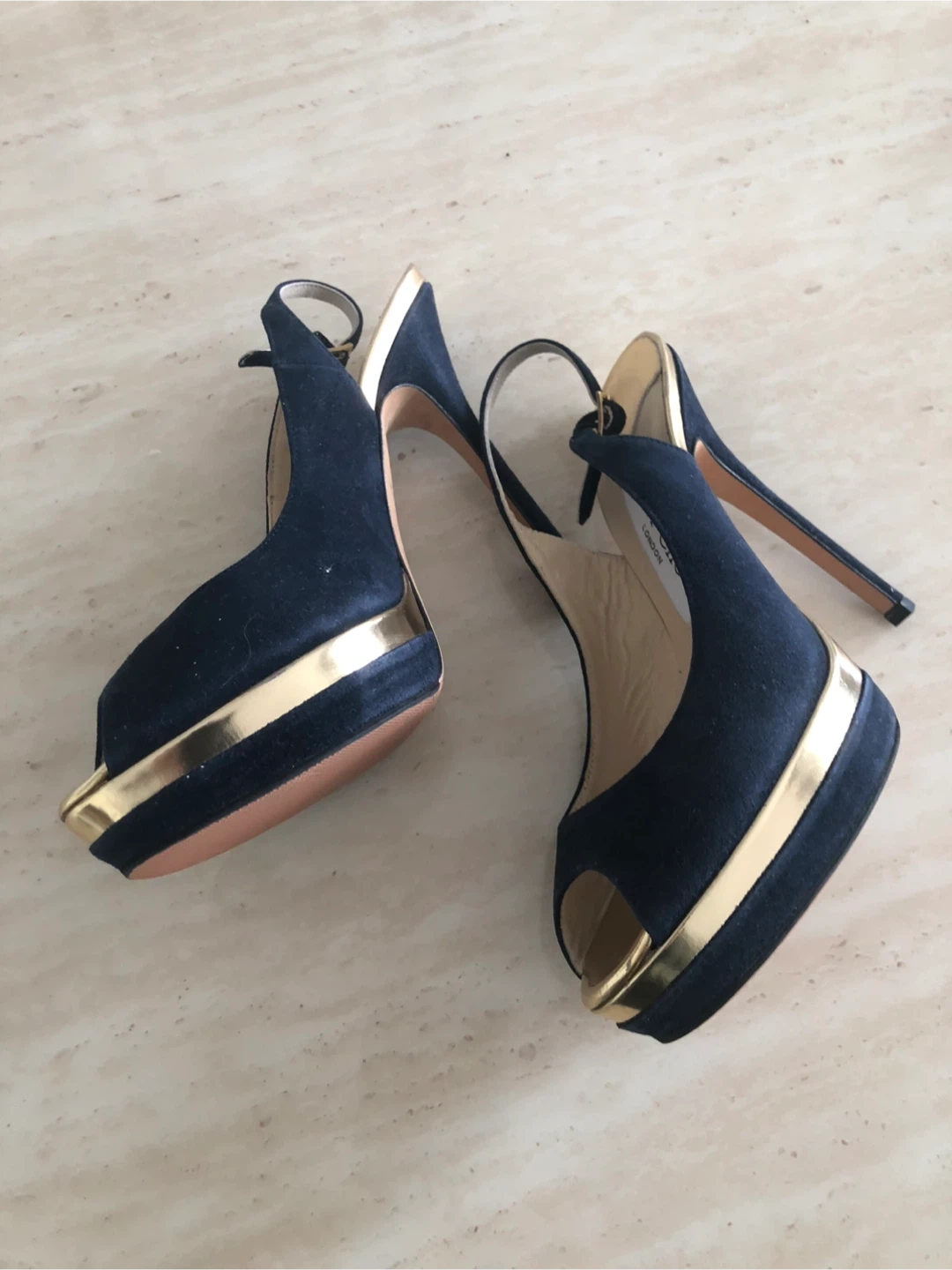 Stylish Jimmy Choo heels in navy suede with gold accents. Features a peep-toe design and platform sole. Comfortable ankle strap closure.